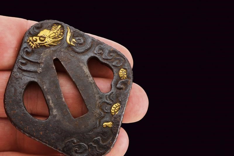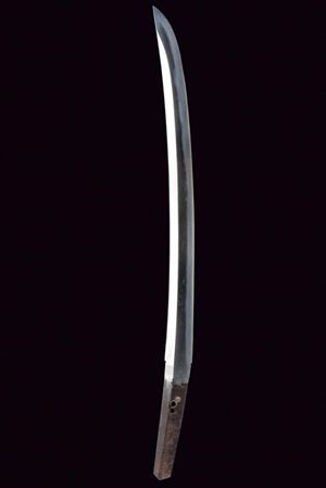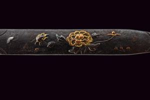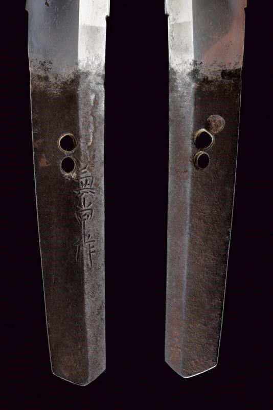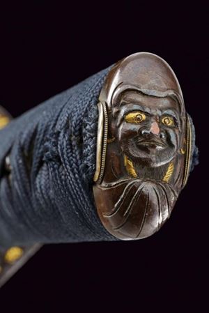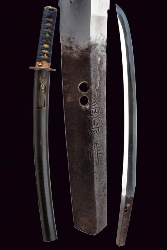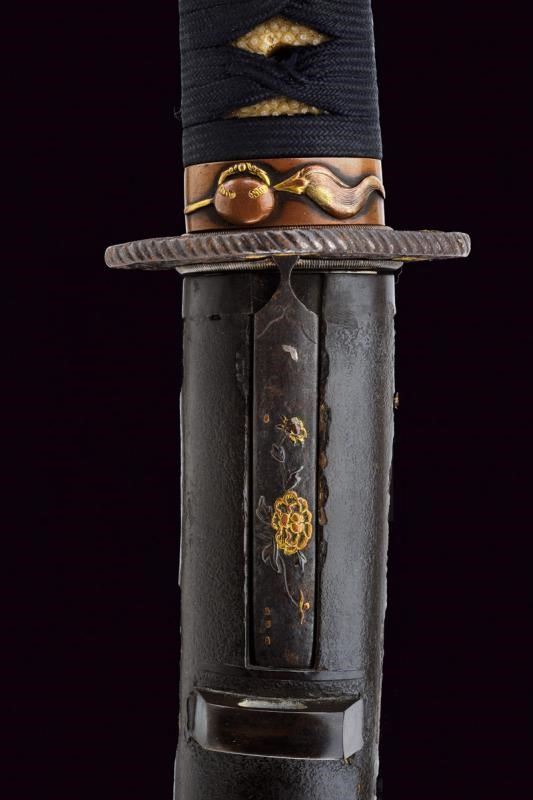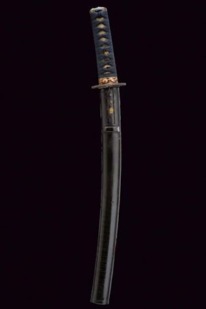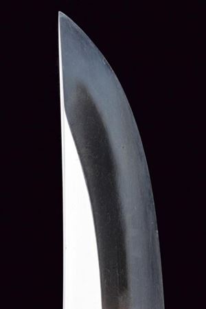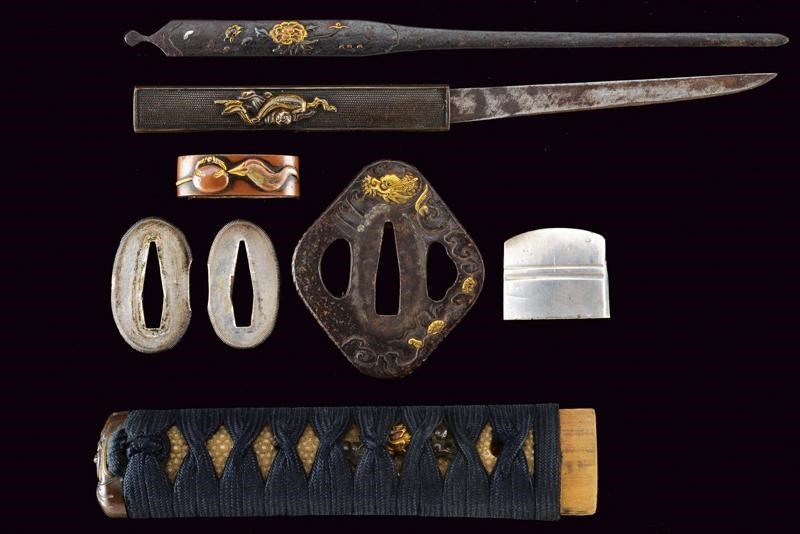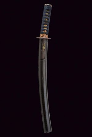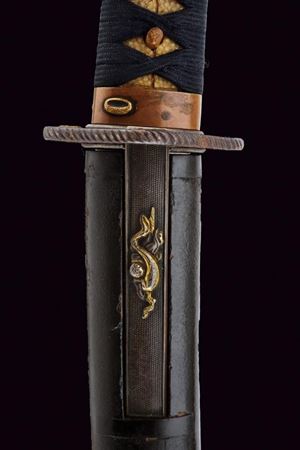 Nagasa 38.2 cm. hada: dame nagare con masame, hamon: hiro suguha con gunome midare togari, habaki in argento. Nakago mei Kane Tsune Saku, con due mekugi-ana. Bella tsuba di forma otafuku-gata in ferro, decorato con un drago in oro fra le nuvole, il dimi con intaccature oblique. Fuchi in shakudo con verdura in altorilievo con parti dorati, kashira con un volto con occhi e naso dorati. Completo di menuki e tsuka-ito in seta nera. Saya in legno laccato (mancanze) munita di kozuka e kogai, anch'essi finemente decorati.