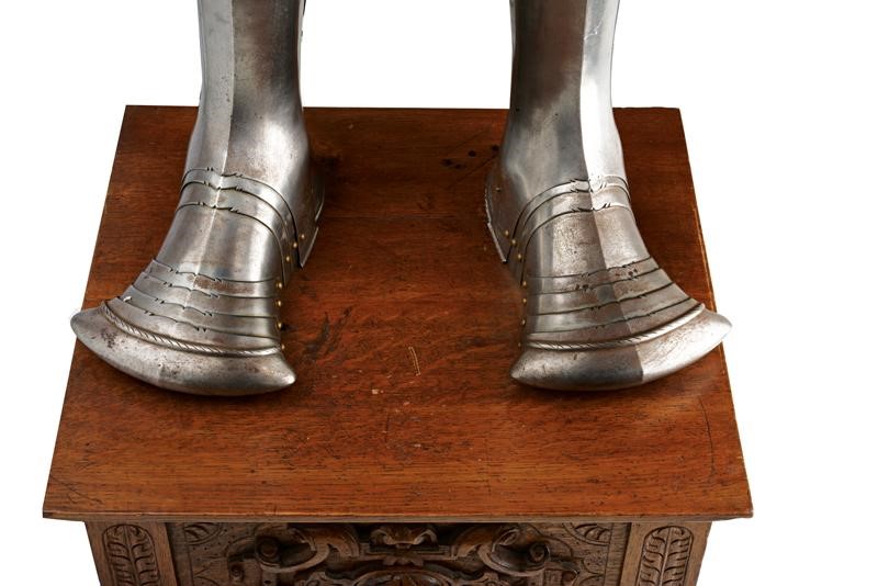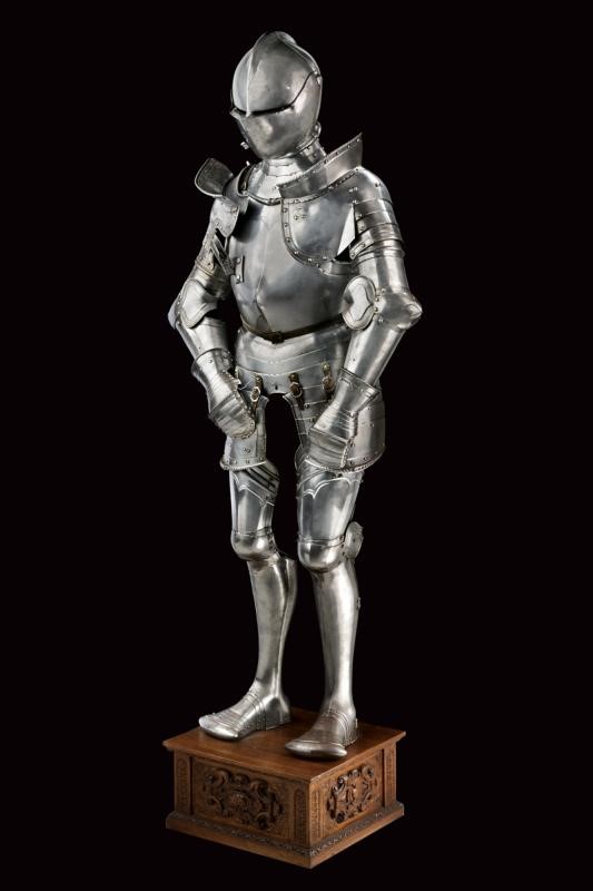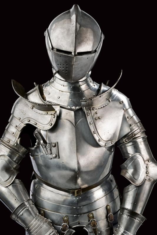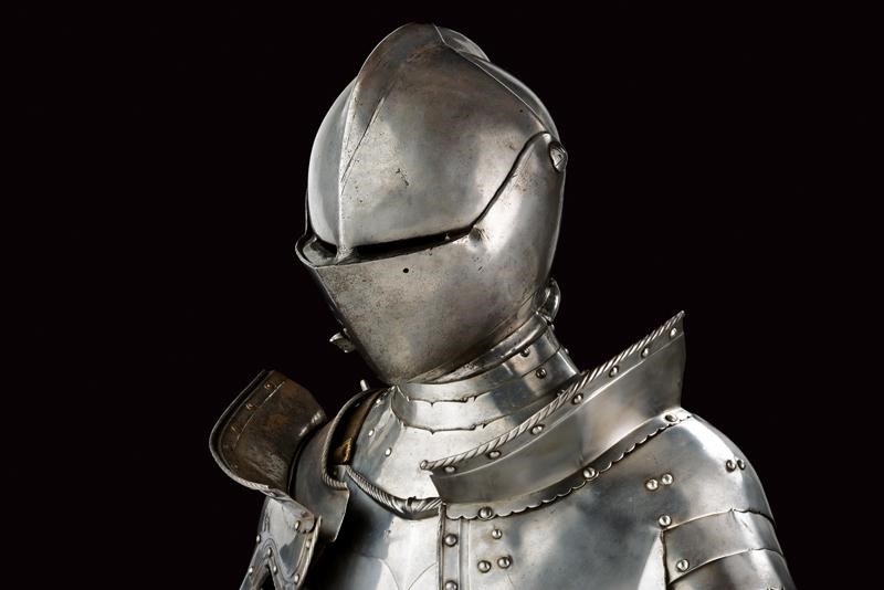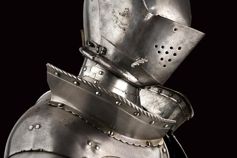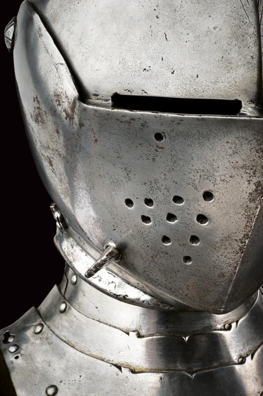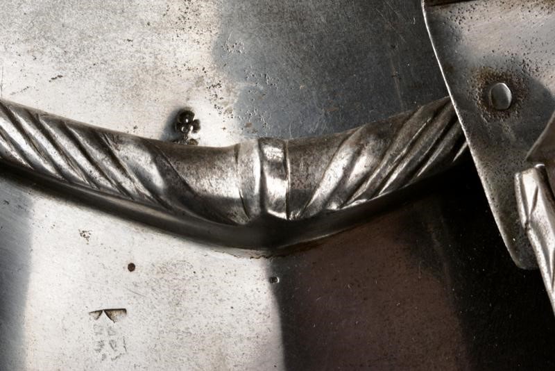 Pesante elmo ad incastro, con coppo in un unico pezzo munito di cresta con incisioni a linee e sommit‡ tondeggiante; vista rialzabile con cresta lavorata en suite con il coppo e con fessure oculari rettangolari, ventaglia appuntita e costolata munita di f