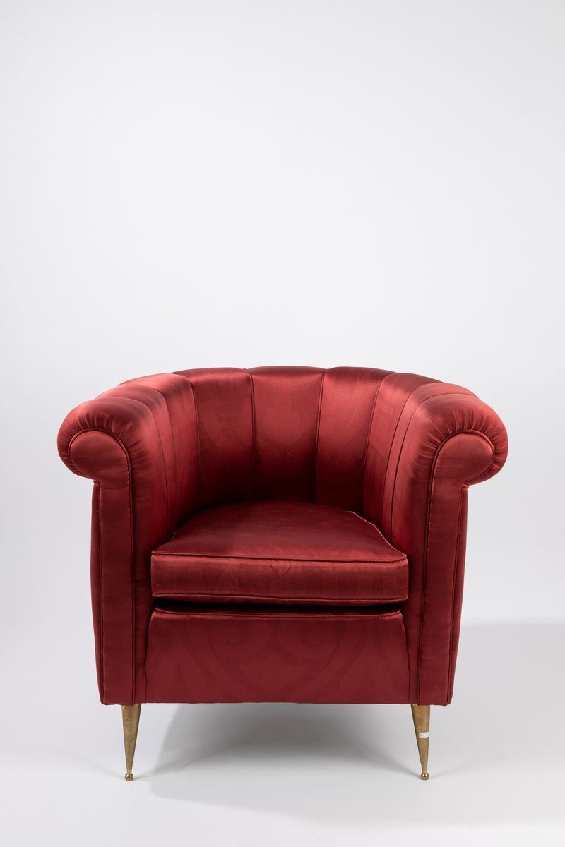 a pozzetto, rivestimento in tessuto, piedini in ottone.