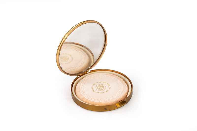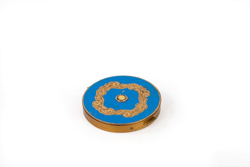 Porta cipria con specchio decorata con smalto blu, motivi vegetali e simbolo Rotary International.