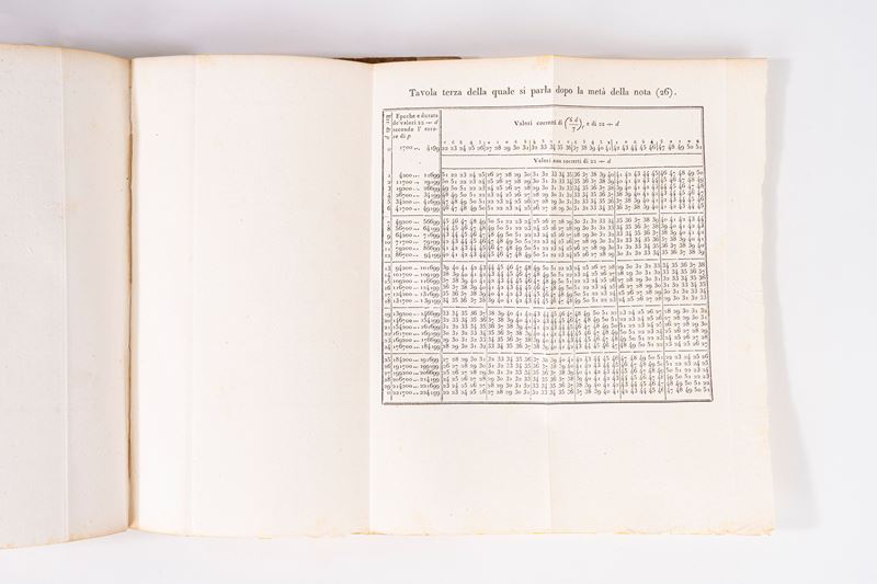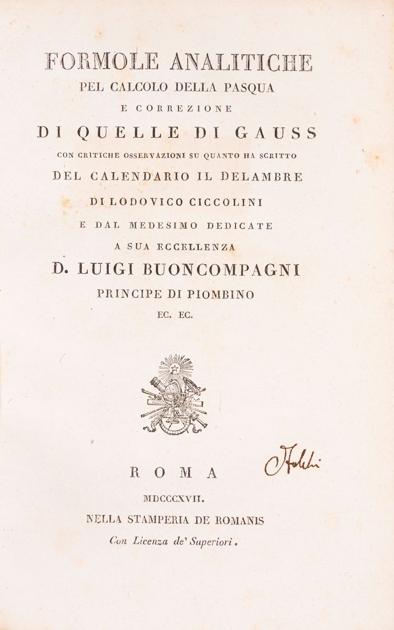 Roma, Stamperia de Romanis, 1817. In 8°. Segue Memoria del Dottor Gaus pel computo della Pasqua recata dalla lingua tedesca nell'italiana corretta ed illustrata con note da Lodovico Ciccolini, segue Osservazioni critiche di Lodovico Ciccolini su quanto scrisse del calendario il Delambre, segue l'Appendice. Diverse tavole ripiegate nel testo, legatura coeva in mezza pergamena con angoli e carta marmorizzata, titolo in oro al dorso, tagli gialli. Tassello cartaceo alla carta di guardia, firma al frontespizio.