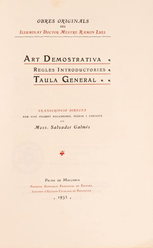 Obres Originals del Illuminat Doctor Mestre Ramon Lull: Art Demostrativa; Regles Introductories; Taula General, 1932