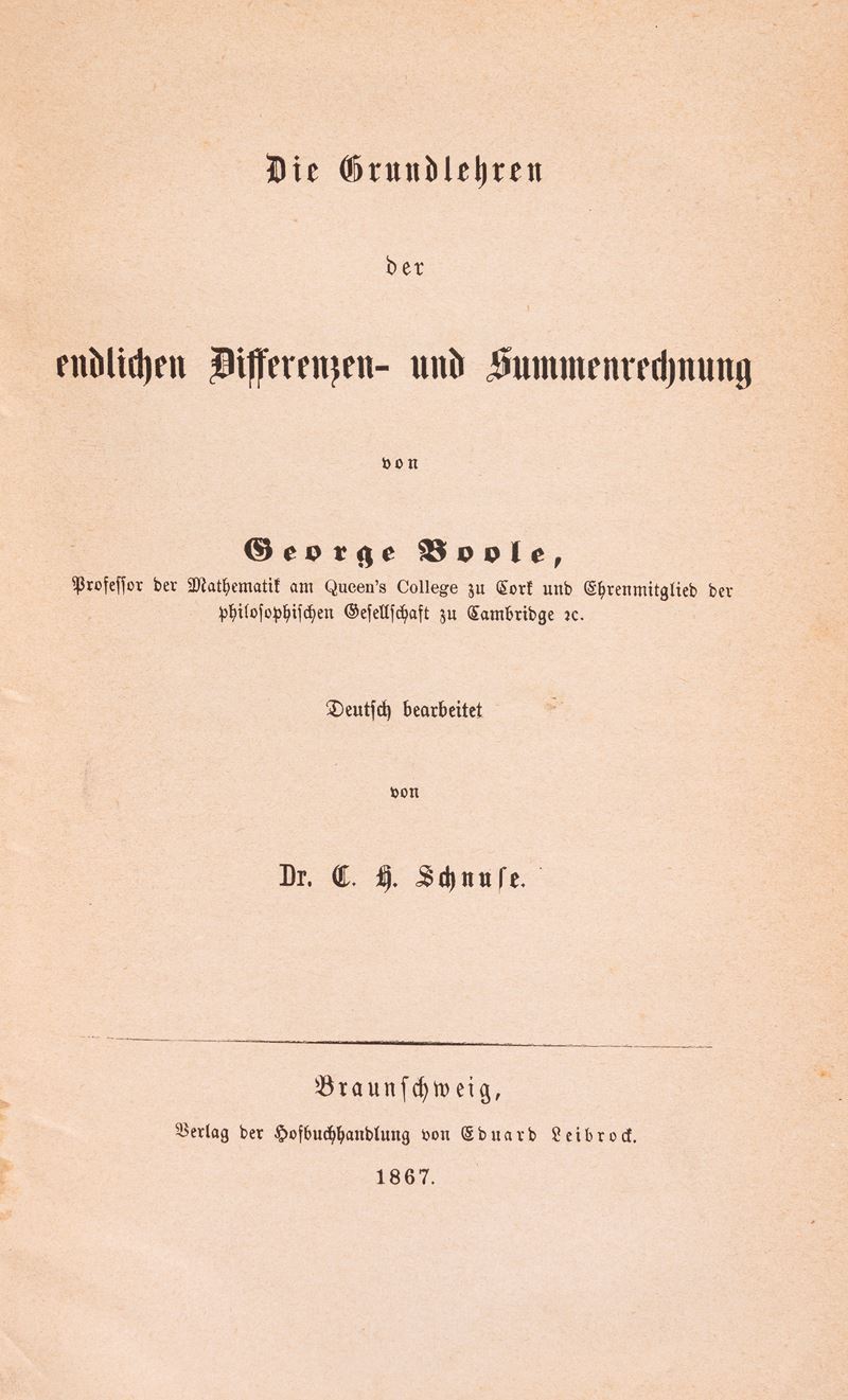 Londra, Richard Cruttwell fo G. and W. Nicol, 1812. In 4°. Ritratto dell'autore al frontespizio, con una tavola ripiegata in fine al volume, alcune carte staccate, lieve brunitura, legatura in cartoncino, piatti staccati, difetti. § Insieme nel lotto Boole, G. Die Grundlehren der endlichen differenzen-und summenrechnung. Braunschweig, Edward Leibrod, 1867.