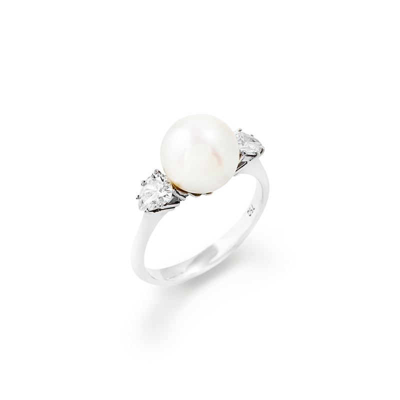 in oro bianco 18kal centro perla coltivata di mm 9,50 circa e ai lati due diamanti taglio goccia per totale ct 0,60 circa.
