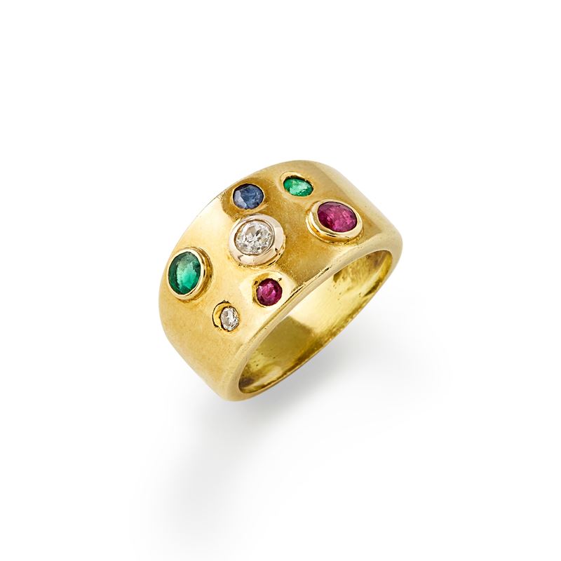 a fascia, con diamanti taglio brillante e rubini, smeraldi e zaffiro taglio rotondo.