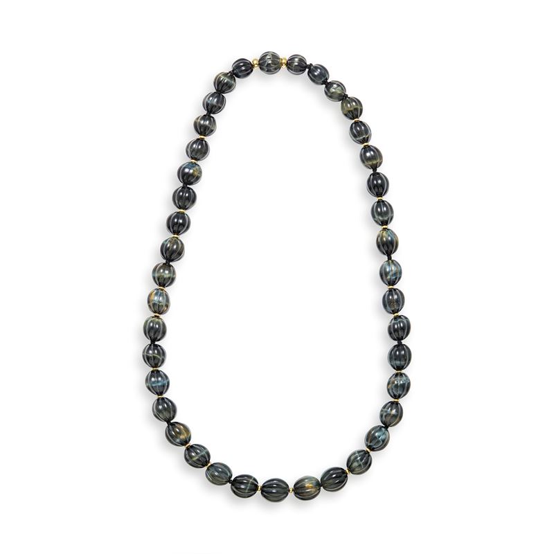in oro giallo 18kcon sfere costolate in pietra dura da mm 15,00 a mm 11,50 circa, chiusura a scomparsa.
