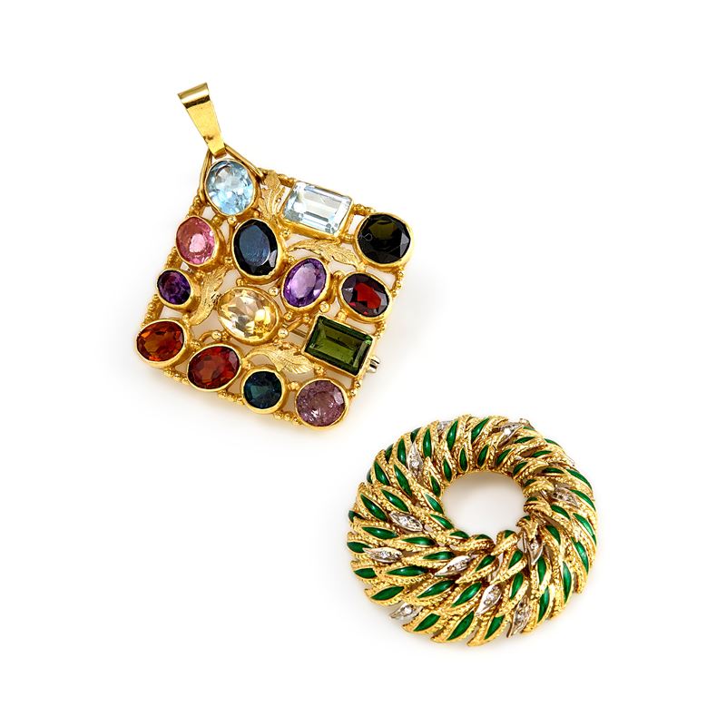 in oro giallo 18kuno a losanga decorato con pietre colorate di tagli, forme e colori diversi; l'altro tondo con motivo fogliaceo decorato da smalto verde e diamanti taglio huit-huit.