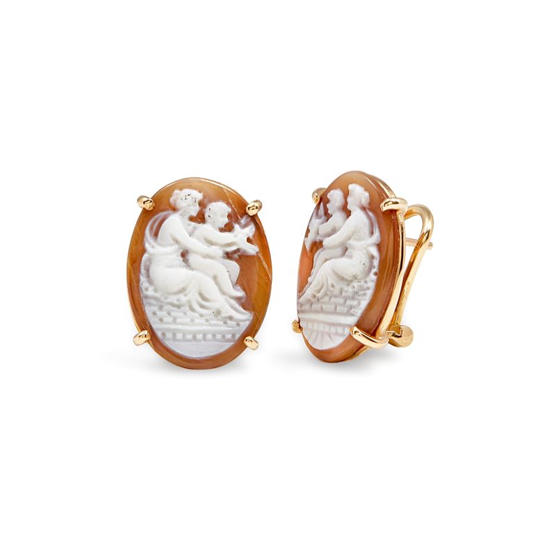 in oro rosso 18kcon cammei su conchiglia, chiusura perno e clip.