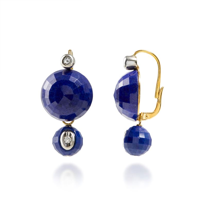 in oro giallo 18ka doppio corpo, con boules sfaccettate in lapislazzuli e castoni con diamanti taglio brillante, chiusura a monachella.