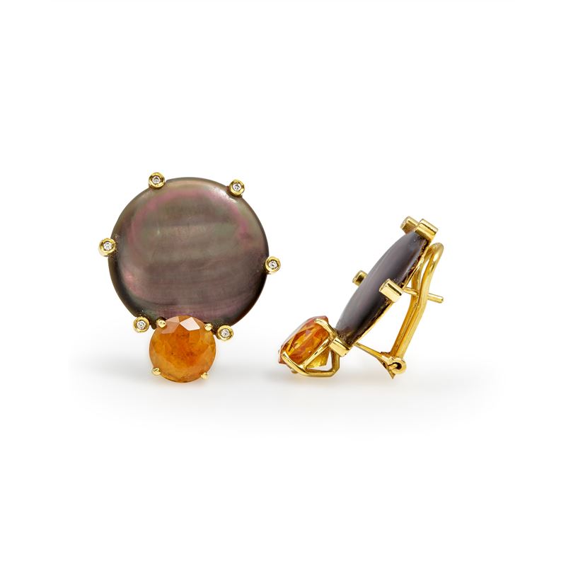 in oro giallo 18krealizzati con disco in madreperla impreziosito da diamanti taglio brillante e quarzo taglio rotondo, chiusura perno e clip.