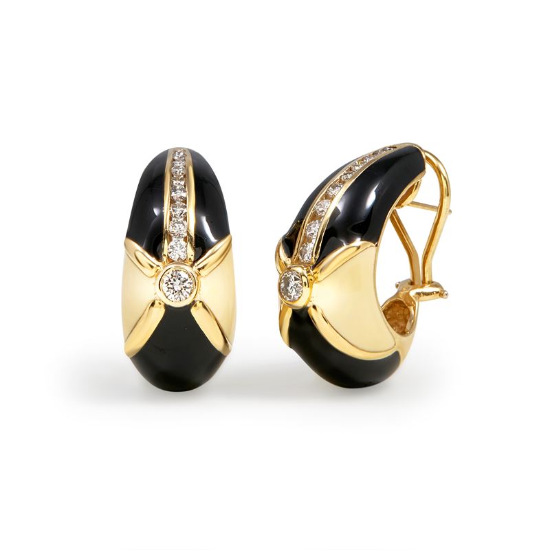 in oro giallo 14ka disegno geometrico, con smalti nei toni del crema e del nero e diamanti taglio brillante per totale ct 0,50 circa, chiusura perno e clip.