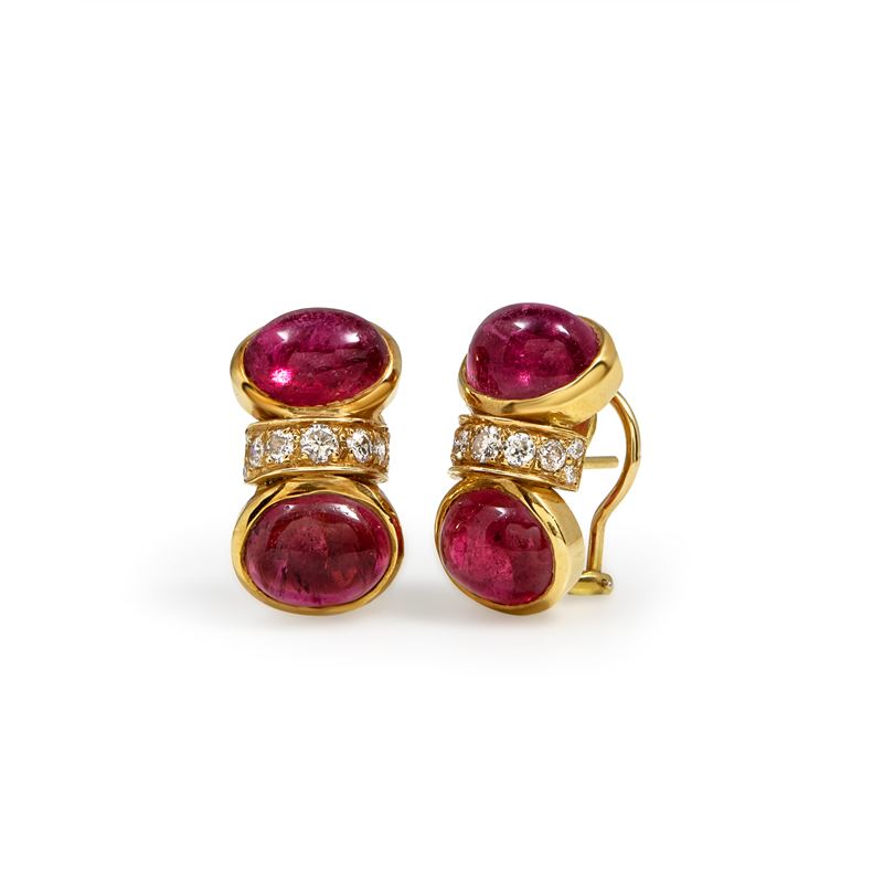 decorati con tormaline rosa taglio ovale cabochon e motivi in diamanti taglio brillante per totale ct 0,50 circa, chiusura perno e clip.