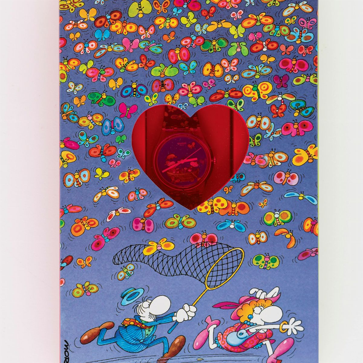 Disegnato dal leggendario fumettista argentino Guillermo Mordillo, questa speciale edizione di San Valentino presenta una variopinta stampa sul cinturino in plastica blu. Il quadrante blu, inserito in una cassa in plastica trasparente, raffigura una coppia di innamorati. Completano il modello in edizione limitata numerata un passante e una fibbia in plastica rigida trasparente.