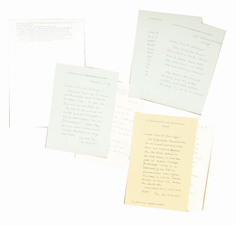 Nove lettere autografe originali firmate e datate, in bella calligrafia su carta intestata di diversa consistenza e colore, indirizzate al “Dr. Griesingen”, collezionista e funzionario della ditta chimico-farmaceutica Bassler. Elenco dettagliato: 1) 18 agosto 1967: 1 foglio 24x15 cm., carta color beige, redatto recto e verso, 26 righe. Intestazione: “Jan Tschichold, Hon. R.D.I. - CH 6611 BERZONA Onernone (Schweiz, Switzerland”. 2) 3 gennaio 1969: 1 foglio 24,5x17,8 cm., carta color verde, redatto al solo recto, 15 righe. Intestazione: “Jan Tschichold, Hon. R.D.I. - Wettstein Allee 115 - CH 4058 Basel”, con una riga che cancella l’indirizzo postale. 3) 8 gennaio 1969: 1 foglio 24,5x17,8 cm., carta color verde, redatto recto e verso, 16 righe, senza firma. Intestazione: “Jan Tschichold, Hon. R.D.I. - Wettstein Allee 115 - CH 4058 Bsel”, con una riga che cancella l’indirizzo postale. Sopra la data è indicato l’indirizzo alternativo: “6611 Berzona (Onsernone)”. 4) 12 gennaio 1969: 1 foglio 24,5x17,8 cm., carta color verde, redatto al solo recto, 16 righe. Intestazione: “Jan Tschichold, Hon. R.D.I. - Wettstein Allee 115 - CH 4058 Bsel”, con una riga che cancella l’indirizzo postale. 5) 17 gennaio 1969: 1 foglio 26,5x17,8 cm., carta color senape, redatto al solo recto, 18 righe. Intestazione: “Jan Tschichold, Hon. R.D.I. - CH 6611 Berzona. 6) 8 febbraio 1969: 1 foglio 25x17 cm., carta color crema, redatto al solo recto, 16 righe. Intestazione: “Basel - Wettsteinallee 115 - Telephon 32 81 71”. Nella data è specificato “Berzona”. 7) 12 febbraio 1969: 1 foglio 25x17 cm., carta color crema, redatto recto e verso, 43 righe di cui 4 in inchiostro rosso. Intestazione: “Basel - Wettsteinallee 115 - Telephon 32 81 71”, cancellata con una riga. 8) 23 marzo 1969: 1 foglio 27,2x20,5 cm., carta bianca, redatto al solo recto , 17 righe. Intestazione: “Basel - Wettsteinallee 115 - Telephon 32 81 71”, cancellata con una riga. Nella data è specificato “6611 Berzona”. 9) 3 novembre 1969: 1 foglio 26,5x17,8 cm., carta color senape, redatto al solo recto, 16 righe. Intestazione: “Jan Tschichold, Hon. R.D.I. - CH 6611 Berzona (Onsernone).