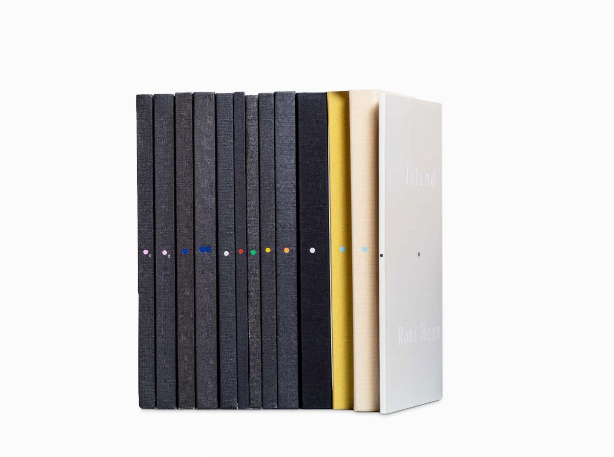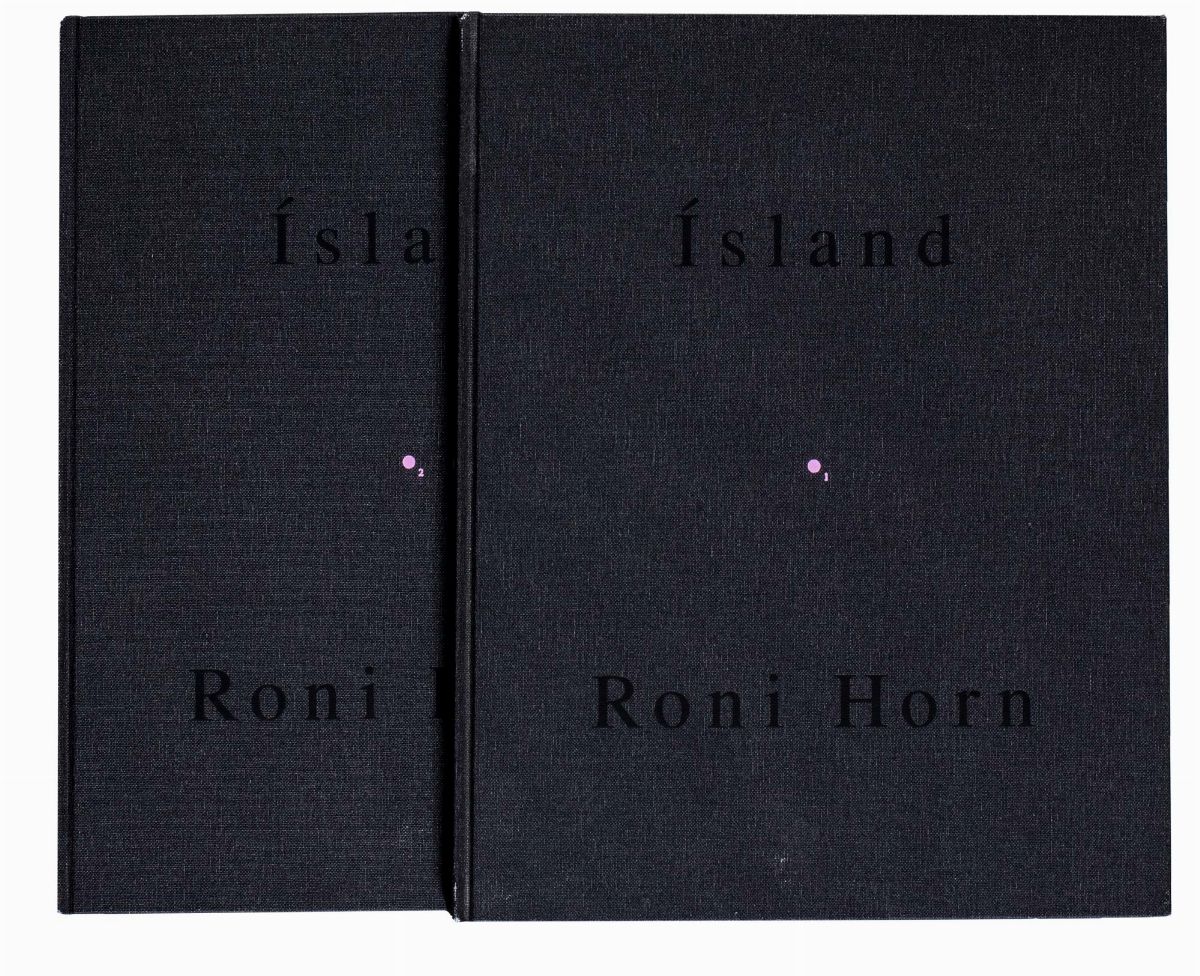 Opera interamente illustrata con disegni e fotografie realizzati appositamente da Roni Horn. Descrizione dei volumi: 1) Island. To Piace. Bluff Life, New York, Peter Blum Edition, 1990; legatura rivestita in tela color grigio antracite, 26x22 cm, pp. 36, graphic design a cura di Roni Horn e Klaus Baumgärtner, tiratura di 1.150 copie. 2) lsland. To Piace. Folds, New York, Mary Boone Gallery, 1991;legatura rivestita in tela color grigio antracite, 26x22 cm, pp. 72, graphic design a cura di Roni Horn e Andrew Mc Call Associates, tiratura di 700 /750 copie. 3) Island. To Piace. Lava, New York, Roni Horn, 1992; legatura rivestita in tela color grigio antracite, 26x22 cm, pp. 96, graphic design a cura di Roni Horn e Andrew Mc Call Associates, tiratura di 750 copie. 4a) (volume I) lsland. To Piace. Pooling Waters (illustrazioni), Köln, Walther Kõnig, 1994; legatura rivestita in tela color grigio antracite, 26x22 cm, pp. 96, tiratura di 1.000 copie. 4b) (volume II) lsland. To Piace. Pooling Waters (testo), Köln, Walther Kõnig, 1994; legatura in tela color grigio antracite, 26x22 cm, pp. 176, tiratura di 1.000 copie. 5) lsland. To Piace. Verne’s Journey, Köln, Walther Kõnig, 1995; legatura rivestita in tela color grigio antracite, 26x22 cm, pp. 56, tiratura di 1.000 copie. 6) lsland. To Piace. Haraldsdòtfir, Denver, Ginny Williams, 1996; legatura rivestita in tela color grigio antracite, 26x22 cm, pp. 96, tiratura di 1.100 copie. 7) lsland. To Piace. Arctic Circles, Denver, Ginny Williams, 1998; legatura rivestita in tela color grigio antracite, 26x22 cm, pp. 136, tiratura di 1.650 copie. 8) lsland. To Piace. Becoming a Landscape, Denver / Köln, Ginny Williams / Walther König, 2001; 26x22 cm, custodia rivestita in tela color giallo mais contenente 2 tomi in brossura. Tomo I: pp. 48, Tomo II: pp. 48, tiratura di 900 copie. 8) lsland. To Piace. Becoming a Landscape, Denver / Köln, Ginny Williams / Walther König, 2001; 26x22 cm, custodia rivestita in tela color carnicino, contenente 2 tomi in brossura. Tomo I: pp. 48, Tomo II: pp. 48. Edizione speciale nella tiratura limitata di 100 copie firmate da Roni Horn con 2 fotografie firmate dall’artista. 9) lsland. To Piace. Doubt Box, Gölttingen, Steidl Verlag, 2006; custodia rivestita in tela nera, 26x22 cm, 28 tavole sciolte in cartoncino, tiratura di 1.000 copie. 10) lsland. To Piace. Haraldsdòttir, Part Two, Gölttingen, Steidl Verlag, 2011; legatura rivestita in tela color grigio antracite, 26x22 cm, pp. 144, tiratura di 1.000 copie. Allegato: Island. To place. Inner Geography, East Greenwich, Meridian Printing Company, 1994; brossura cartonata, pp. 32, catalogo della mostra interamente illustrato a colori con testi di Alex Castro e Jan Howard. Questo volume è erroneamente considerato un supplemento del terzo volume. Tiratura di 2.000 copie. [Bibliografia: Philippe Aarons – Andrew Roth, In Numbers. Serial Publications by Artsts Since 1955, s.l., PPP Editions, 2009: pp. 388-393; Andrea Joostens - Petra Roettig, Kunstlerbucher / Artists’ books. Die Sammlung / The Collection, Hamburg, Hamburger Kunsthalle, 2018: pp. 66-67; Martin Arr - Gerry Badger, The Photobook. A History, London, Phaidon, 2006-2008, 2 volumi: volume II, pp. 164-165; Andrew Roth, The Open Book. A history of the photographic book from 1878 to the present, Götheborg, Hasselblad Center, 2004: pp. 348-351].