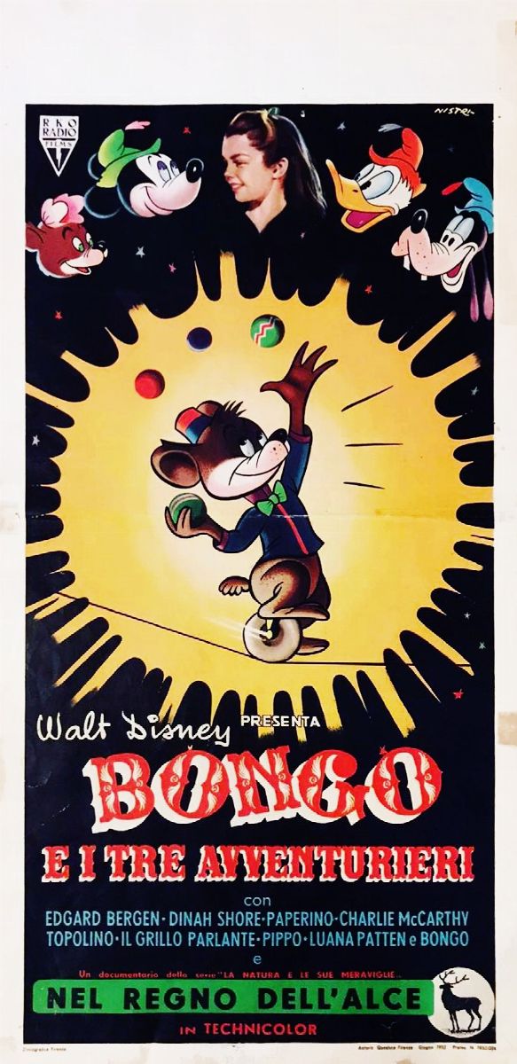 Bozzetto preliminare realizzato da Giuliano Nistri per la locandina ufficiale del classico Disney "Bongo e i tre avventurieri", prodotto dalla Walt Disney Productions nel 1947. Firmato.
