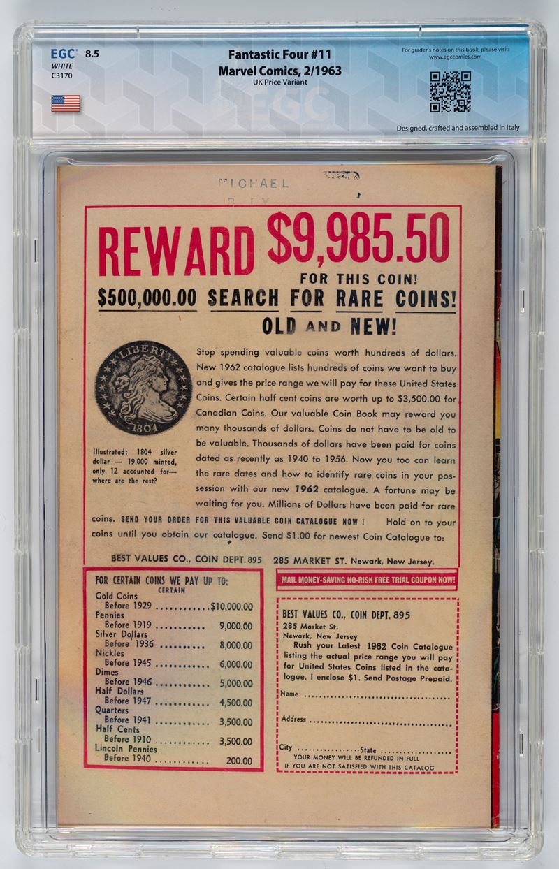 Tutti i fumetti sono gradati da EGC - European Grading Company, un servizio di valutazione dei fumetti che si distingue per la sua precisione e trasparenza. EGC utilizza una scala decimale completa da 0 a 10 per valutare lo stato dei fumetti, permettendo una valutazione estremamente dettagliata. Ogni fumetto viene esaminato da tre esperti valutatori che concordano insieme la valutazione finale. Il sistema di grading di EGC è applicabile a fumetti di qualsiasi epoca, senza differenziazioni tra capolavori del passato e nuove gemme. La valutazione finale viene pubblicata sia sul sito web di EGC che consegnata in formato prestigioso al proprietario del fumetto ed è liberamente visionabile grazie ad un QR Code che trovate sul retro e grazie al quale potete prendere visione del lavoro svolto dai valutatori.