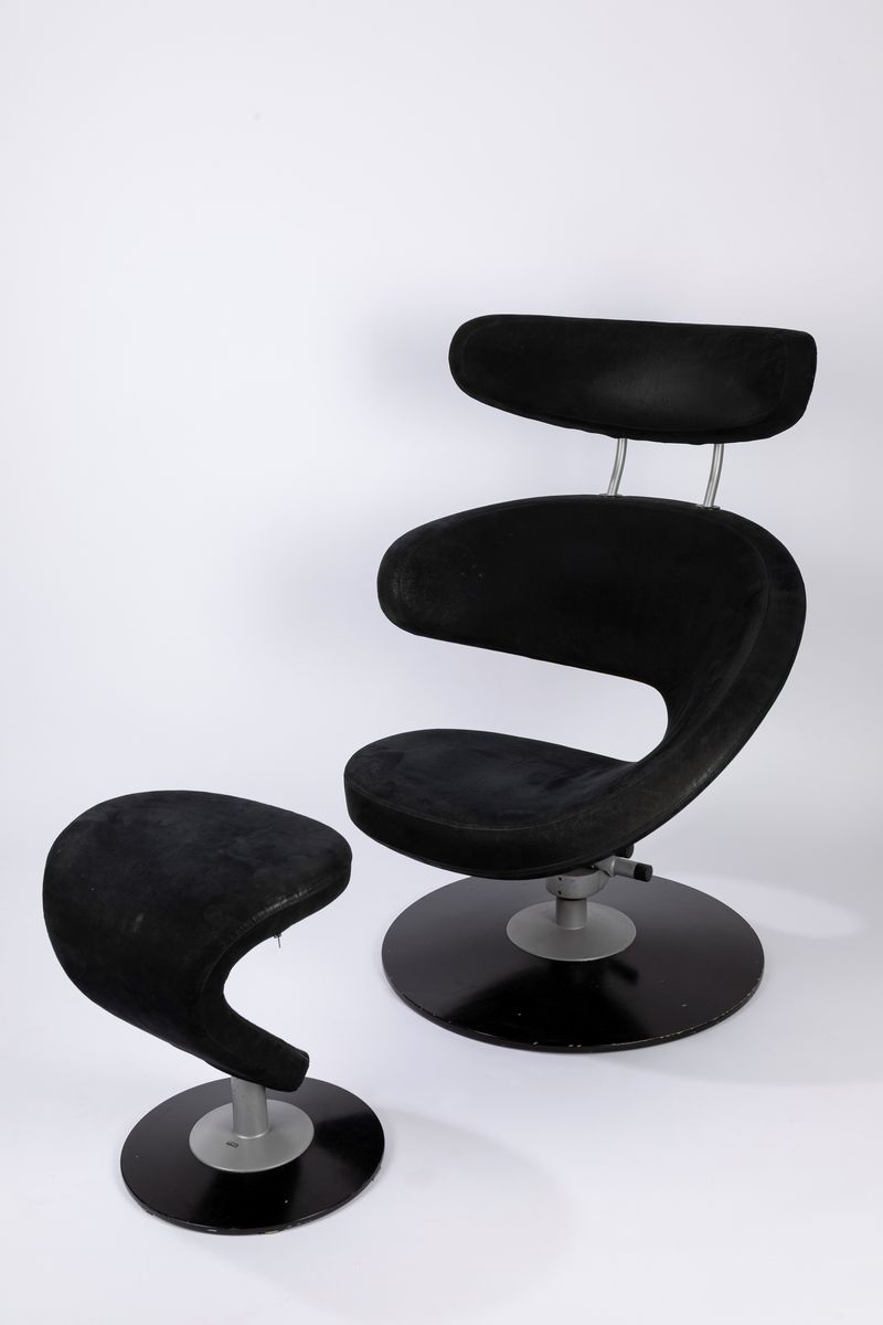 poltrona ergonomica e poggiapiedi rivestiti in alcantara.