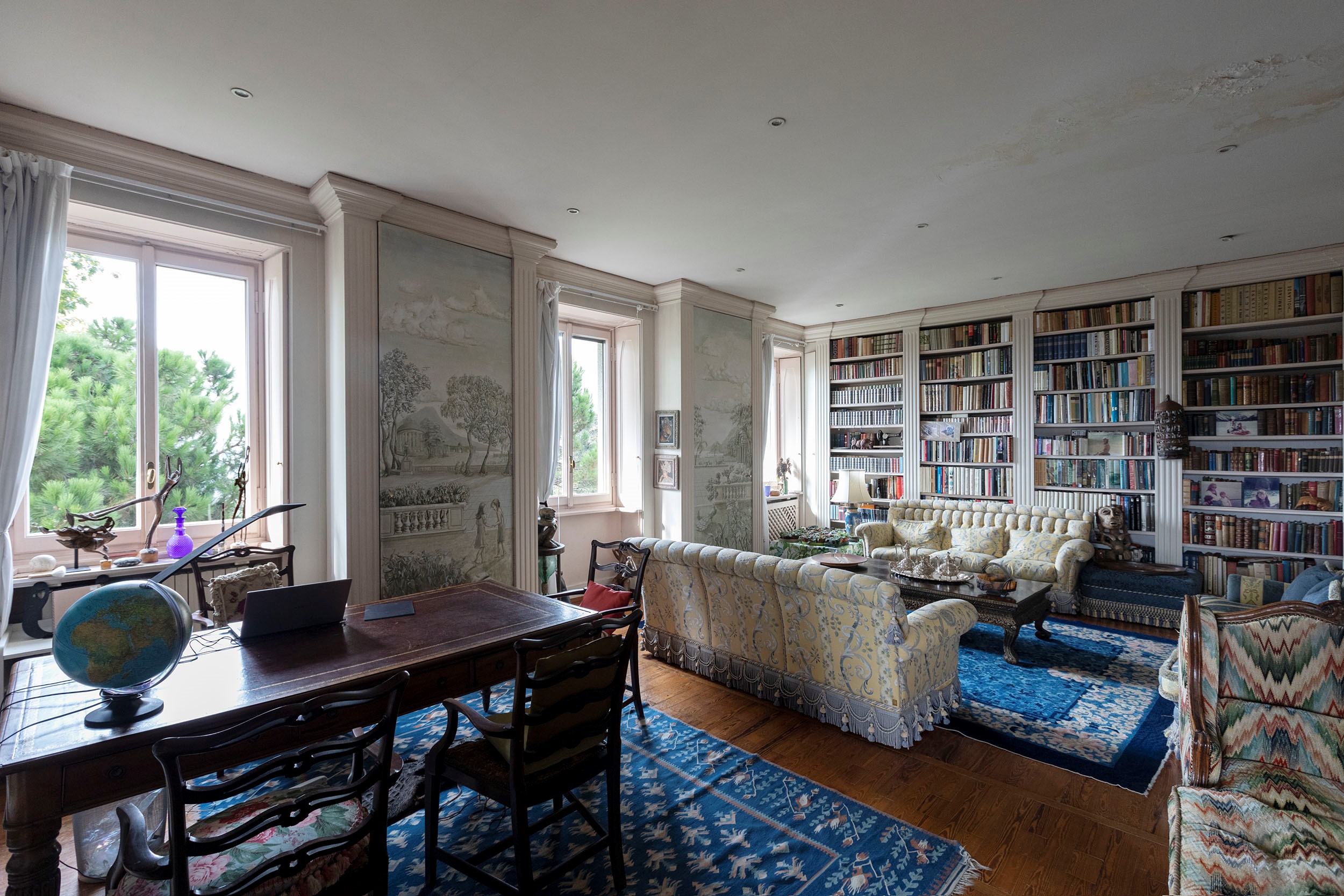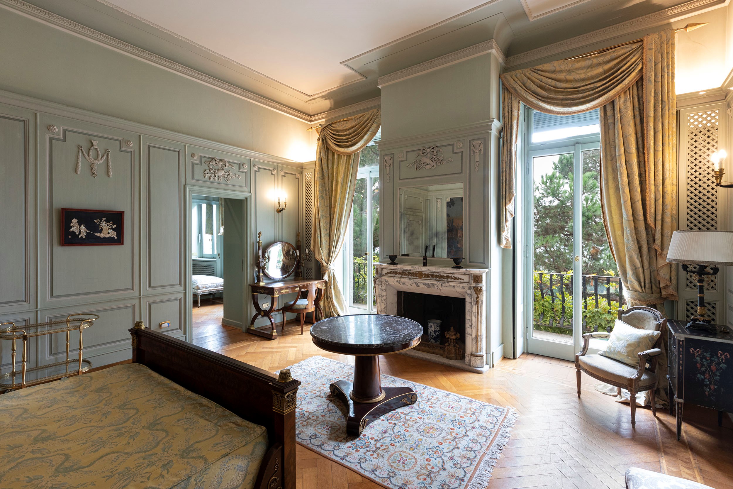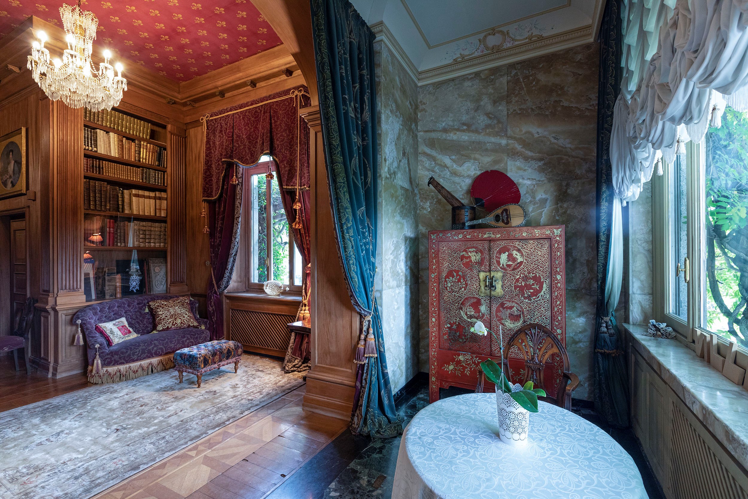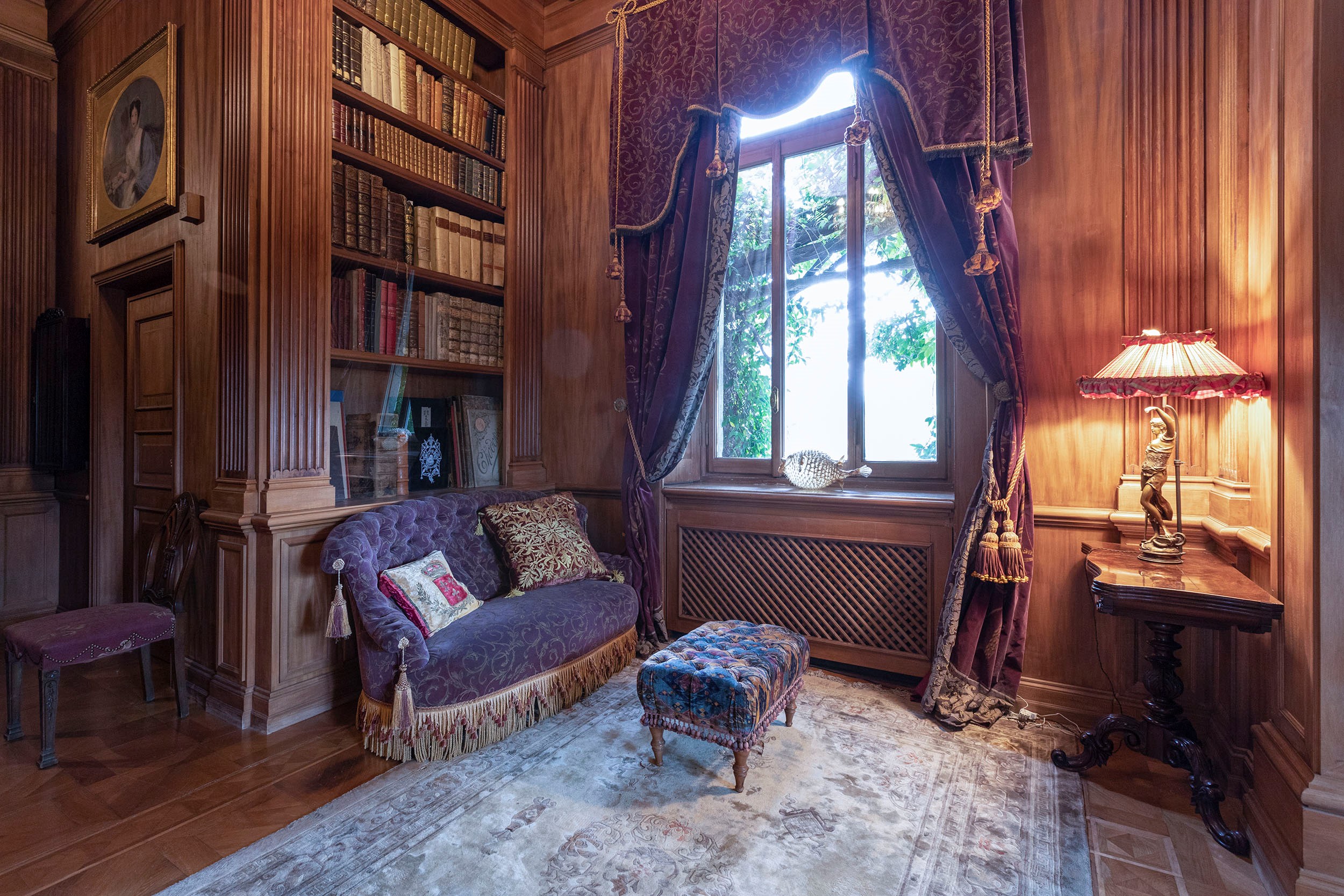 Questa grandissima stanza, completamente rifatta, comprende un soffitto in boiserie primi ‘900, un camino di grandi dimensioni in marmo rosa screziato, originale francese Louis XV, due specchi contrapposti di grandi dimensioni. Le grandi finestre si aprono sul terrazzo e sulla balconata sopra il giardino, con vista mozzafiato. Alle pareti sono presenti due paraventi giapponesi rarissimi, di grandi dimensioni, del ’500.