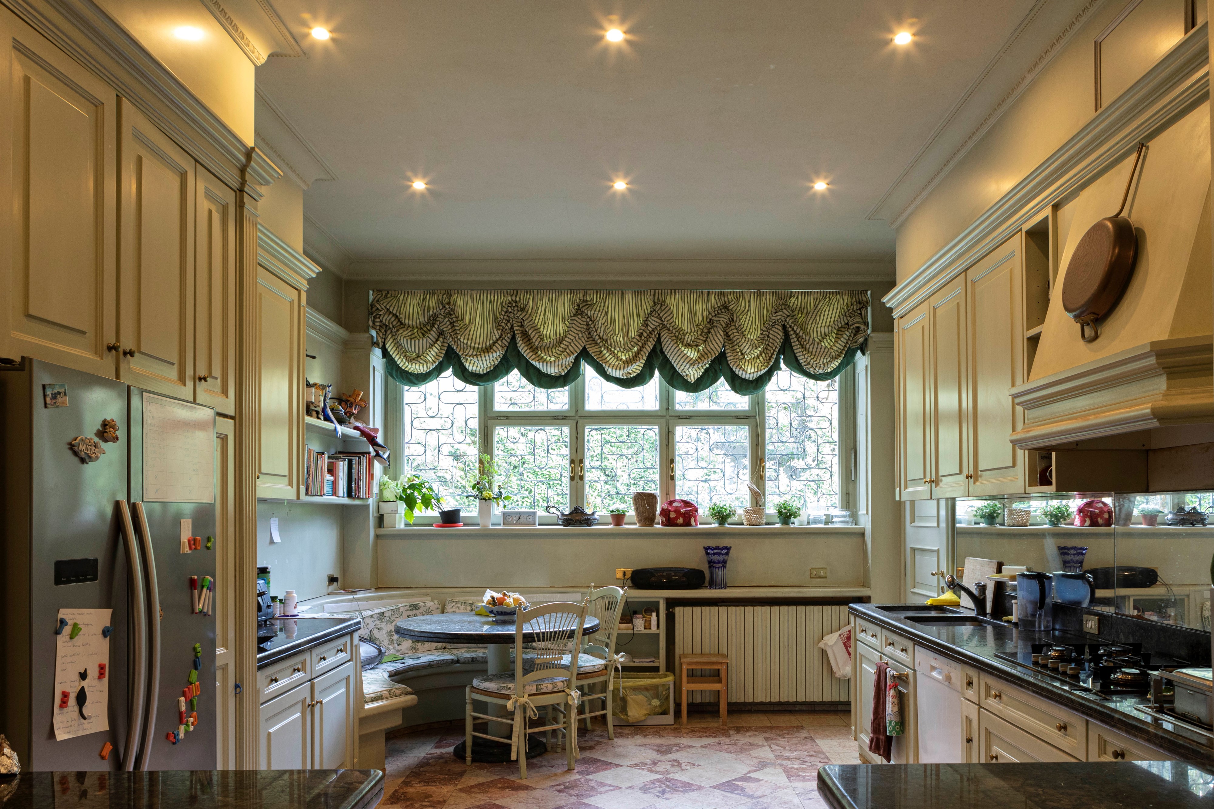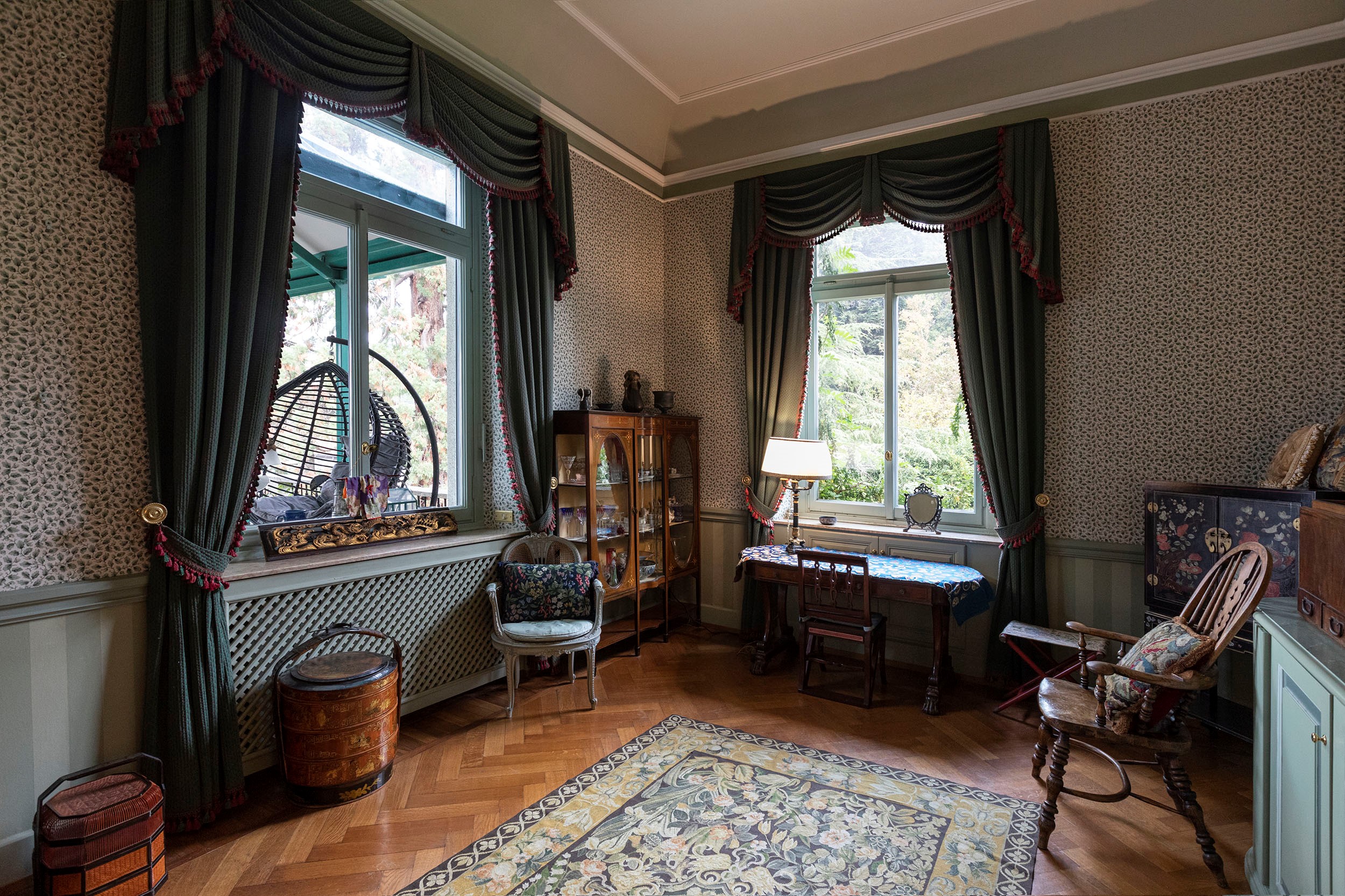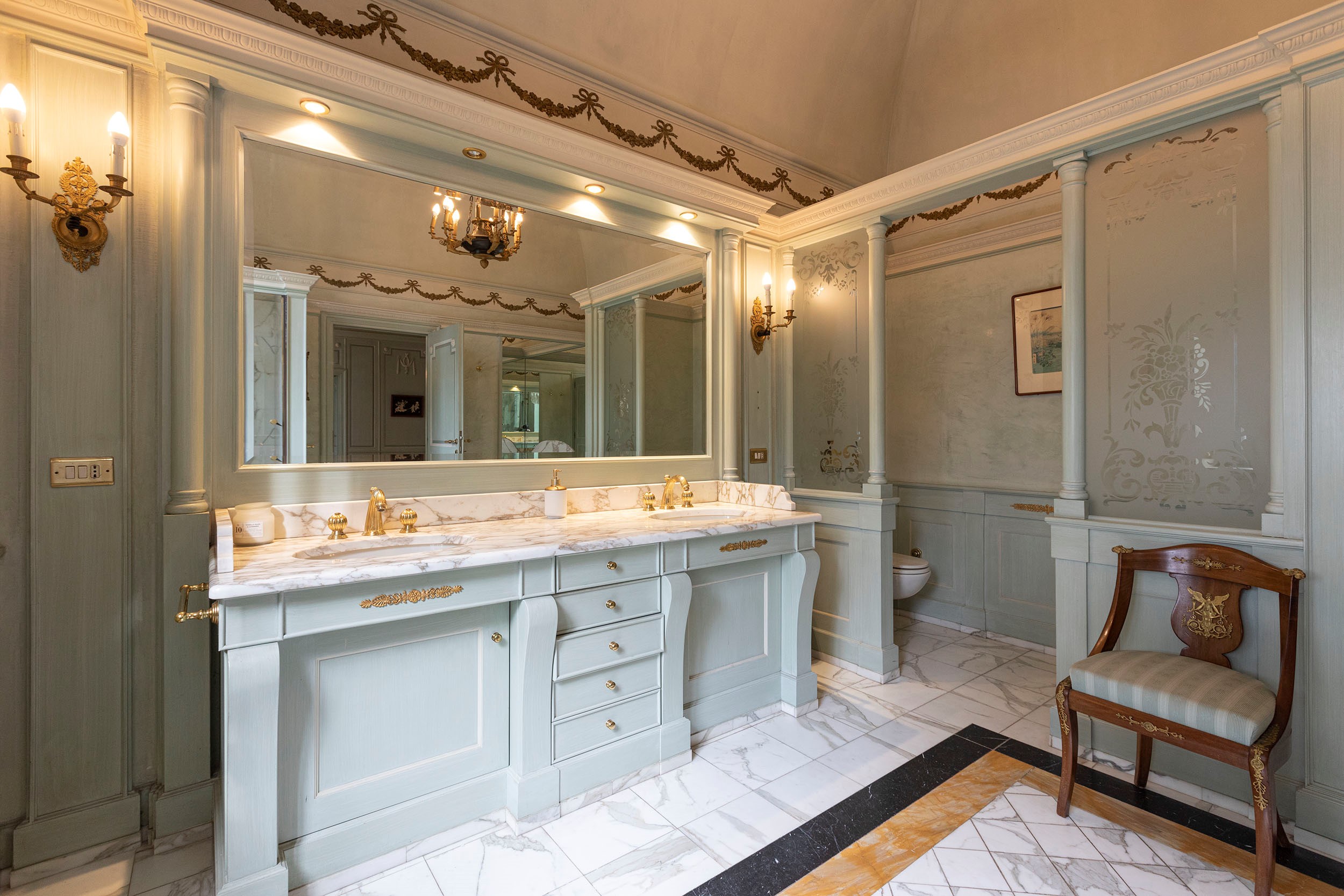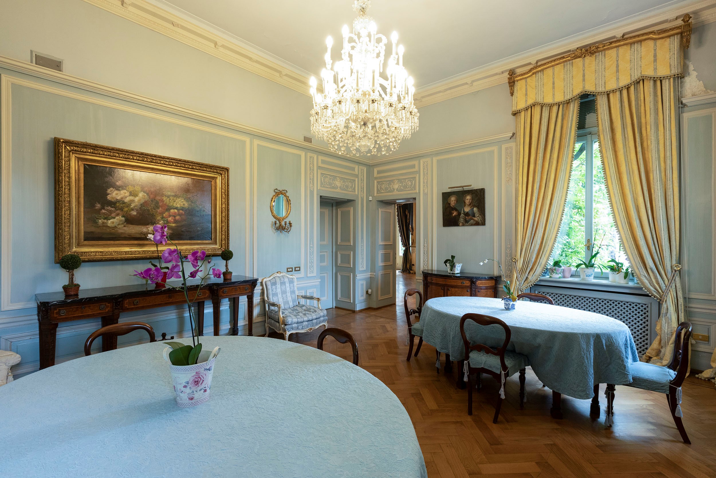 Questa grandissima stanza, completamente rifatta, comprende un soffitto in boiserie primi ‘900, un camino di grandi dimensioni in marmo rosa screziato, originale francese Louis XV, due specchi contrapposti di grandi dimensioni. Le grandi finestre si aprono sul terrazzo e sulla balconata sopra il giardino, con vista mozzafiato. Alle pareti sono presenti due paraventi giapponesi rarissimi, di grandi dimensioni, del ’500.