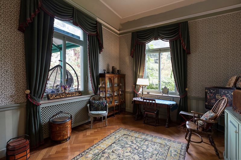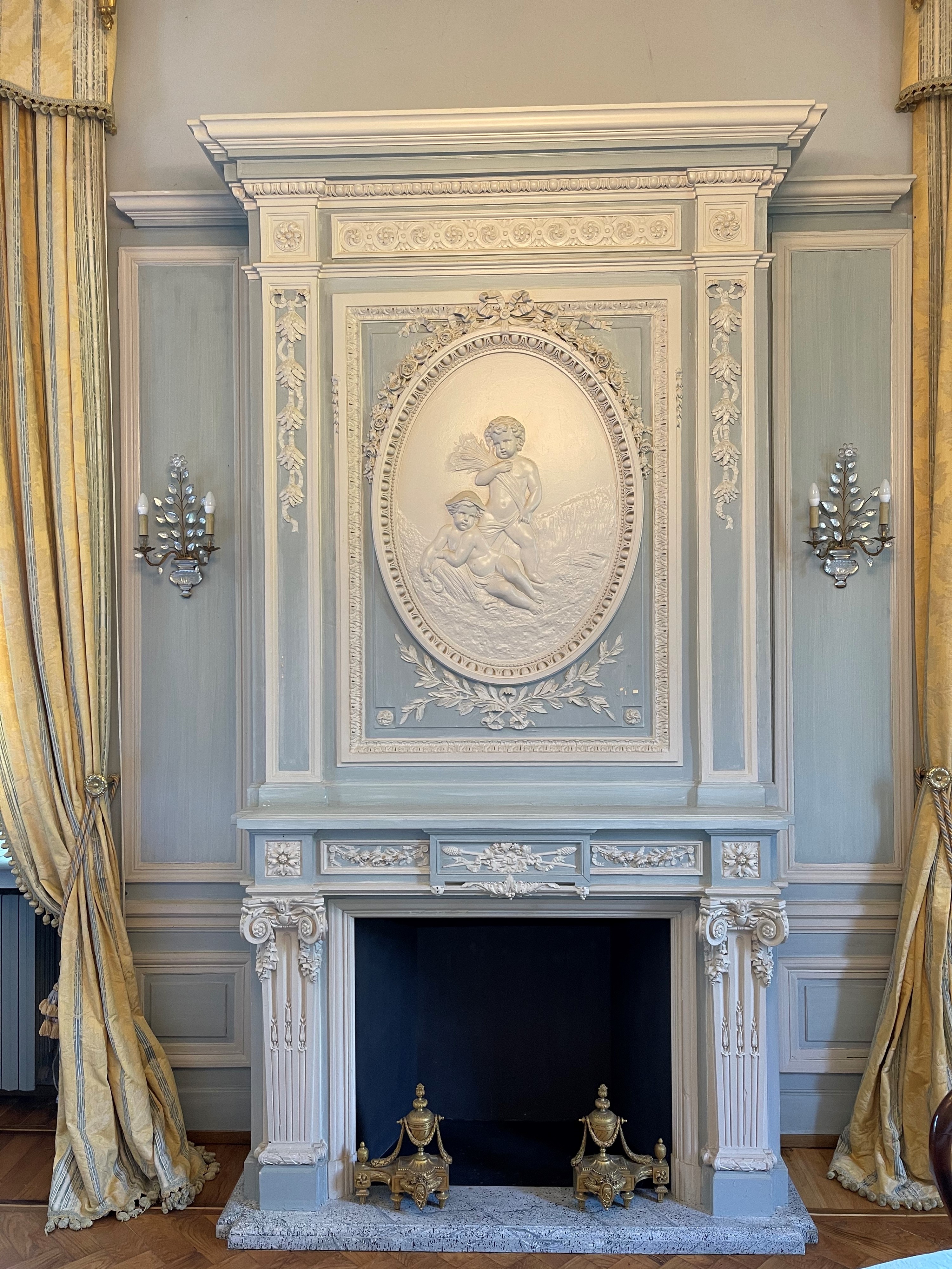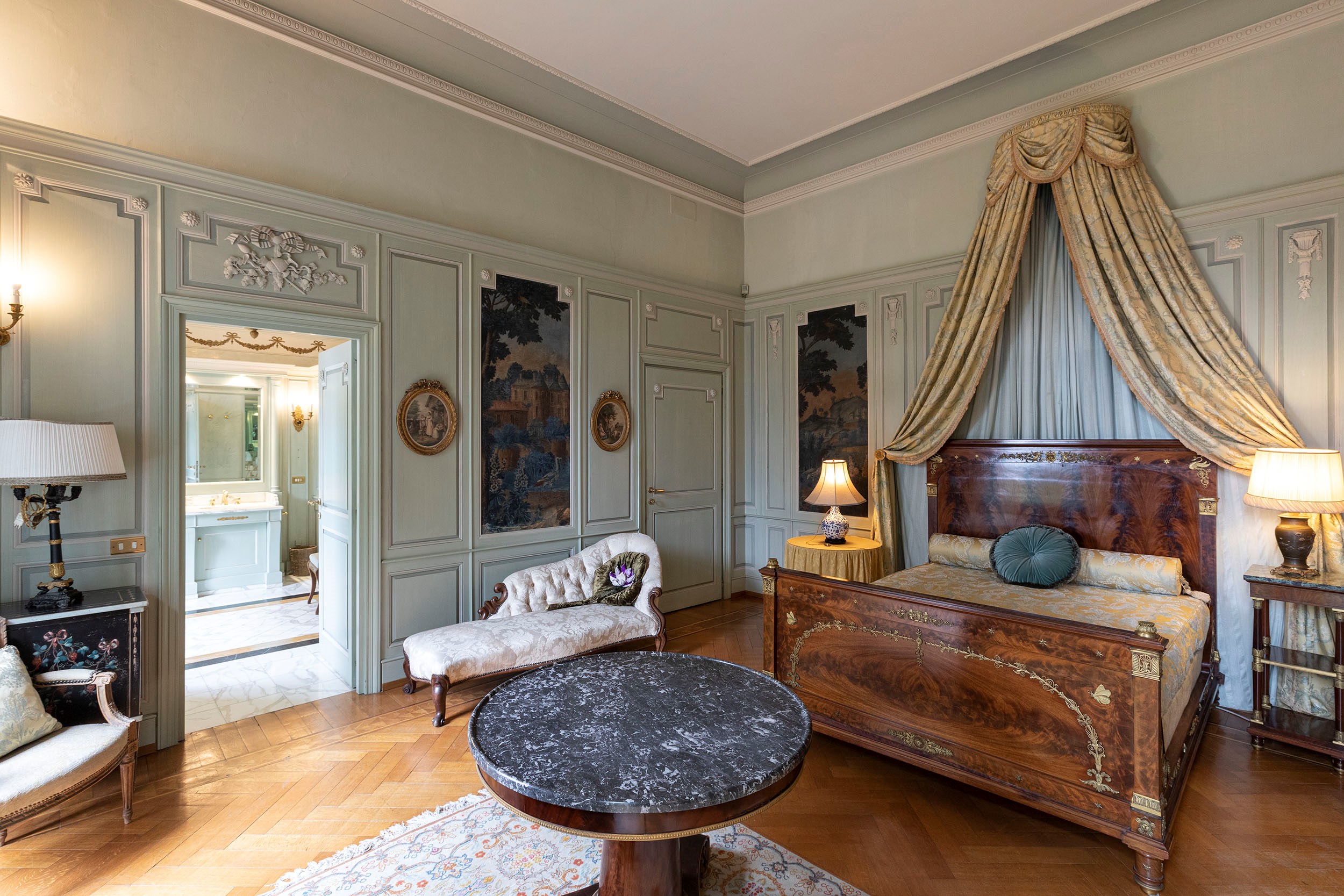Tutta la stanza utilizza boiserie, stucchi, tre arazzi alle pareti, camino, appliques, décor del soffitto e lampade provenienti da un castello francese del ‘700 (raffigurato negli arazzi). Le tende sono adattamenti sfarzosi nello stile dell’epoca. Dalle due finestre si accede a un terrazzo riadattato in ferro battuto, con vista sul giardino e tutta la catena delle Alpi.