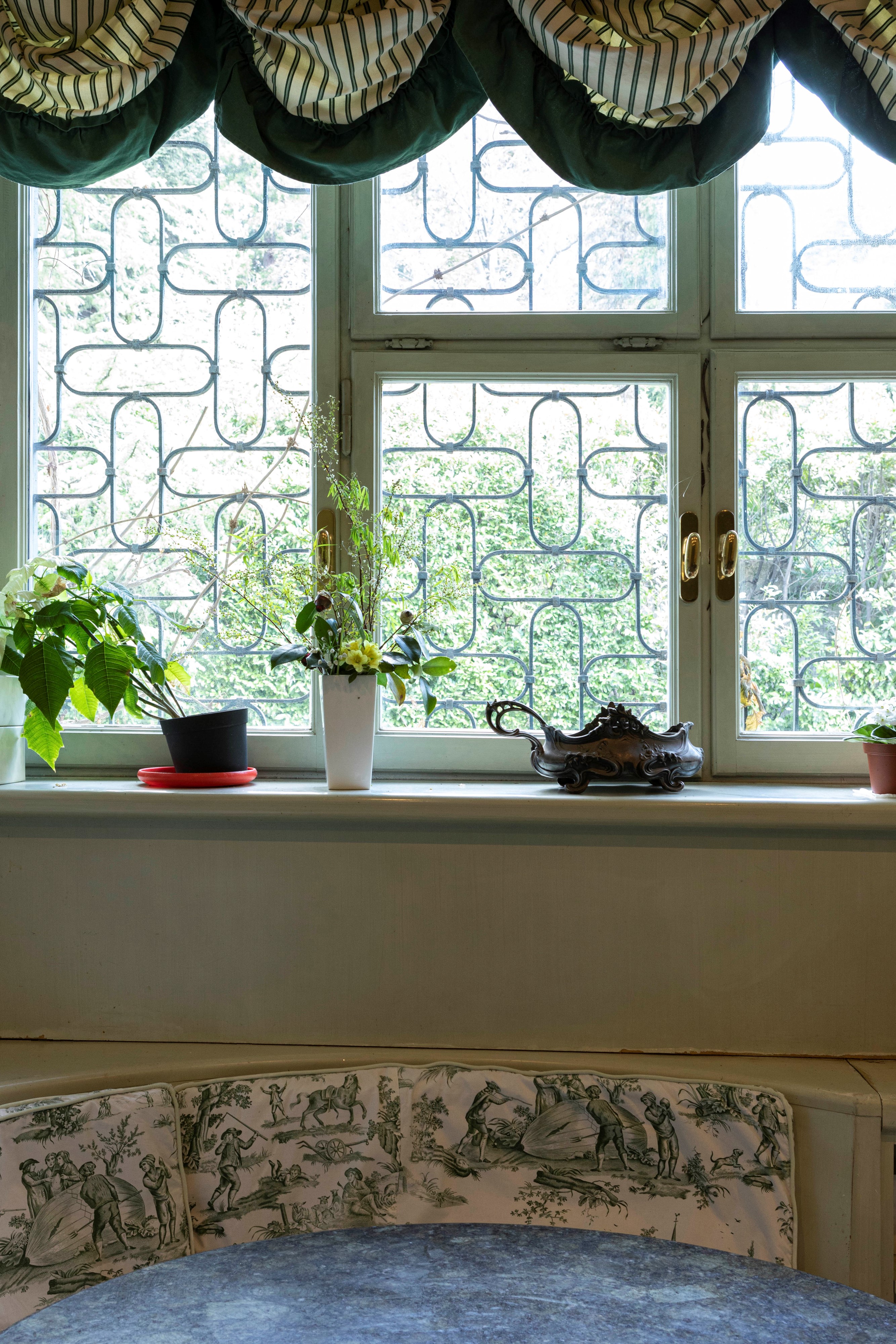 Finestra in ferro battuto lavorato Art Nouveau, tende, décor, armadio in stile. Servizi con preziosi marmi, pietre con ammanniti fossili, lavabo in marmo originali del ‘700 veneziano.