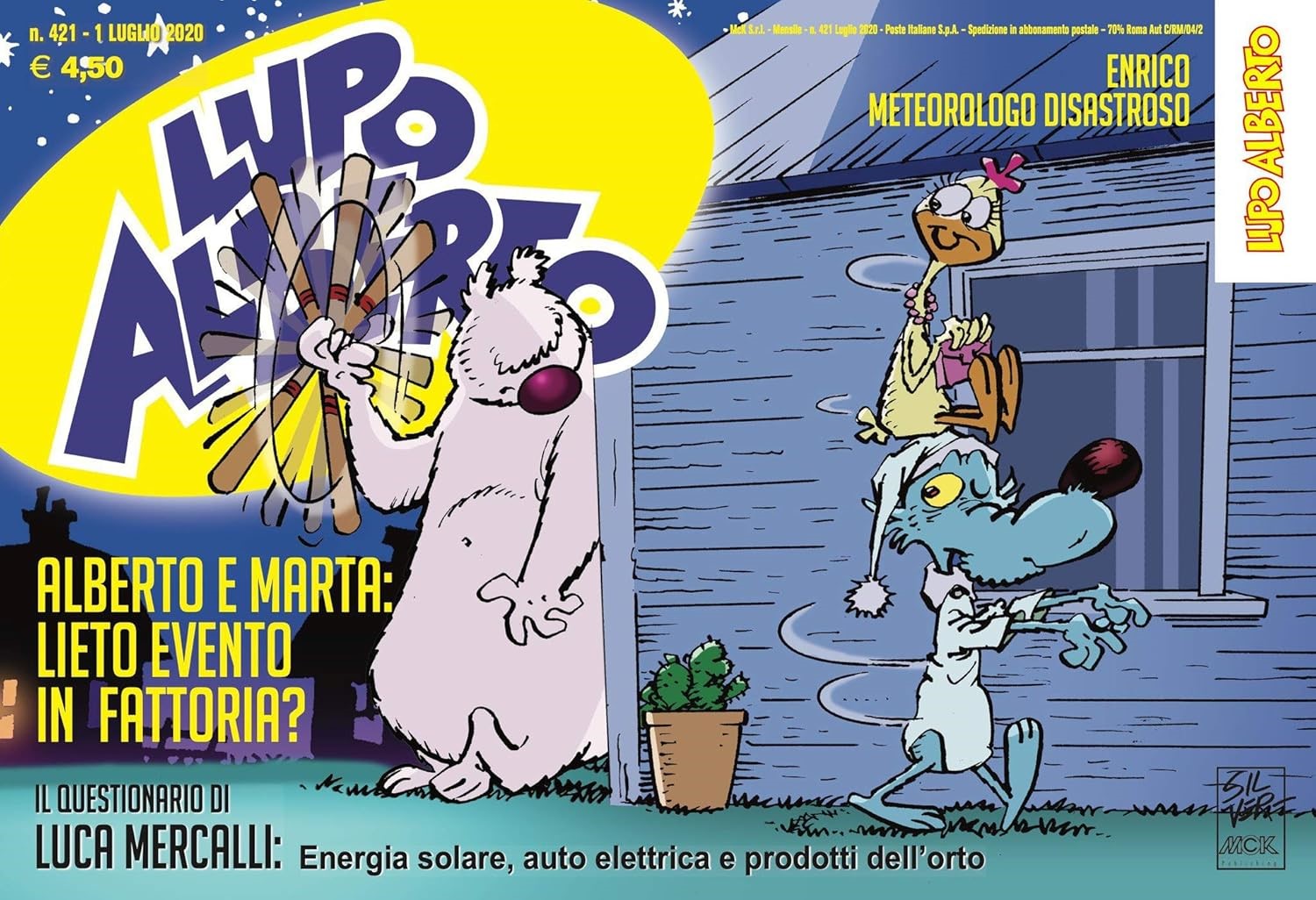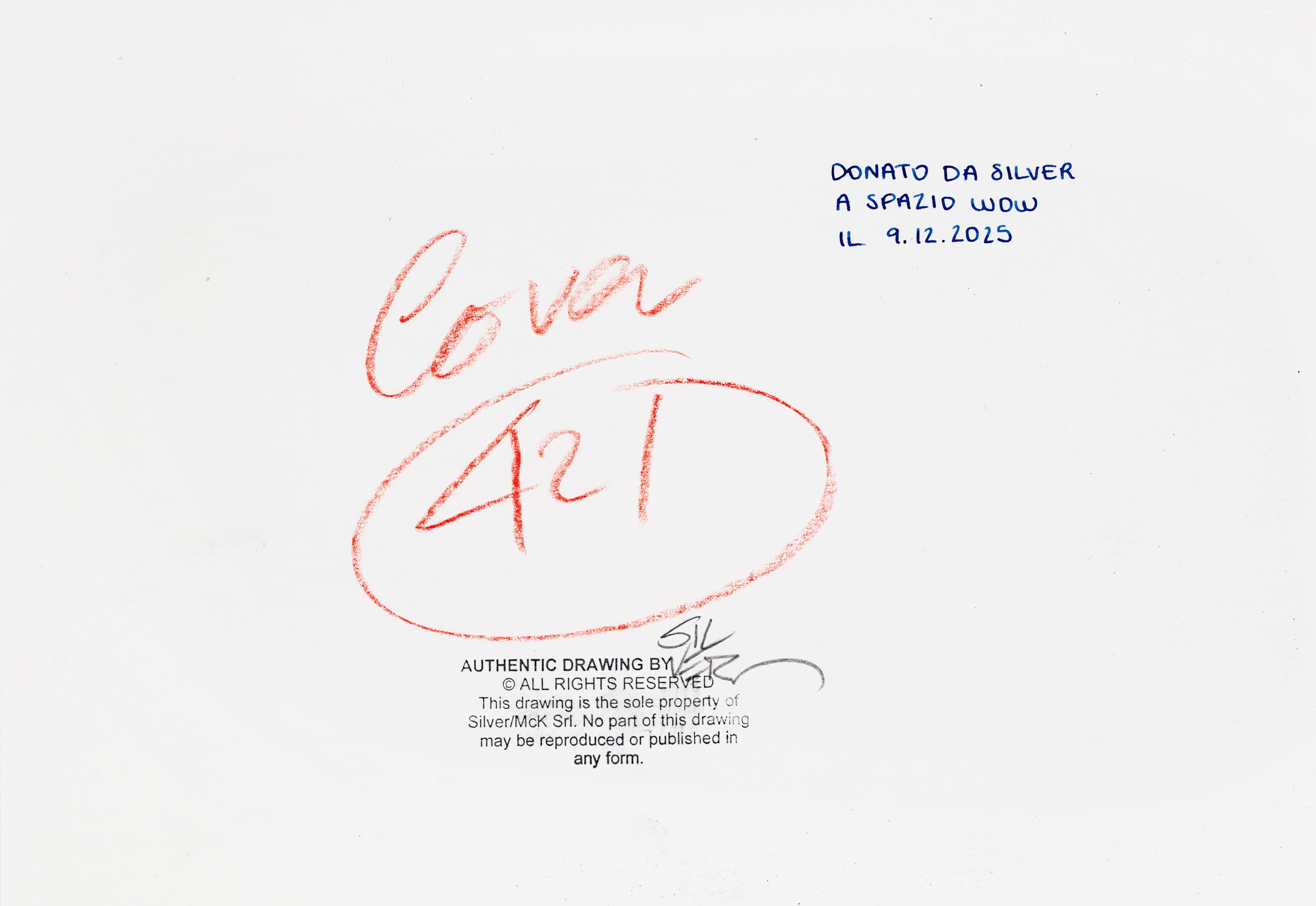 Originale di copertina realizzato da Silver per Lupo Alberto n. 421, edito dalla McK nel Luglio del 2020. Silver compie il suo apprendistato nello studio di Bonvi, dove lavora a personaggi già noti quali Nick Carter, Cattivik e Capitan Posapiano. Nel 1974 avviene la svolta: sul Corriere dei Ragazzi debutta con una striscia di sua invenzione, che vede come protagonisti gli animali di una fattoria. Benché nella prima striscia il protagonista sia un gallo, è subito un simpatico lupo azzurro a rubare la scena: nasce così il successo quarantennale di Lupo Alberto. Per la prima volta sul mercato una copertina di Lupo Alberto, di grande rarità. Firmata al fronte, firmata e timbrata al retro.