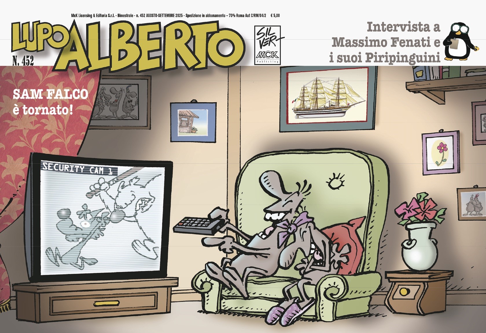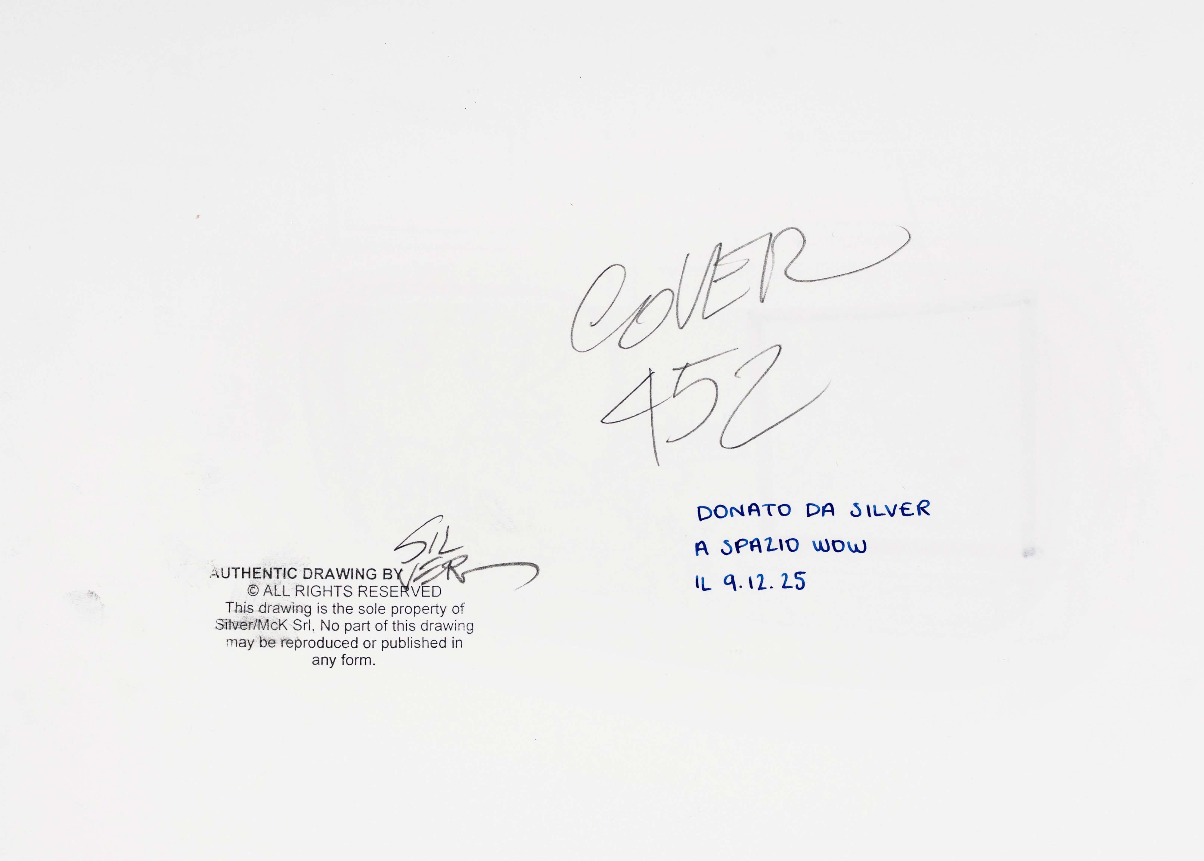 Originale di copertina realizzato da Silver per Lupo Alberto n. 452, edito dalla McK nell'Agosto del 2025. Silver compie il suo apprendistato nello studio di Bonvi, dove lavora a personaggi già noti quali Nick Carter, Cattivik e Capitan Posapiano. Nel 1974 avviene la svolta: sul Corriere dei Ragazzi debutta con una striscia di sua invenzione, che vede come protagonisti gli animali di una fattoria. Benché nella prima striscia il protagonista sia un gallo, è subito un simpatico lupo azzurro a rubare la scena: nasce così il successo quarantennale di Lupo Alberto. Per la prima volta sul mercato una copertina di Lupo Alberto, di grande rarità. Firmata al fronte, firmata e timbrata al retro.