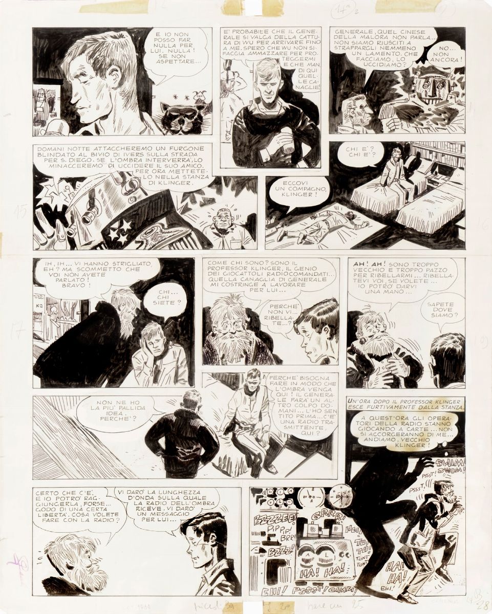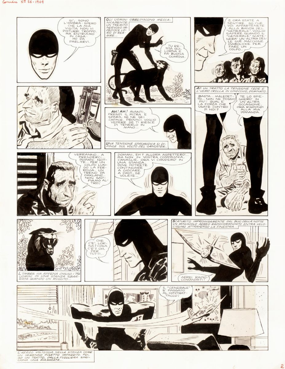 - Original comic art done by Pratt for "L’Ombra", published on page 2 of the first episode entitled "L’Ombra contro il Generale" on Corriere dei Piccoli n. 26 in 1964. The very first pages of this famous series by Pratt/Ongaro were re-mounted for the reprint on the volume "L’Ombra" published by Ivaldi in 1982. Slight creases at the corners.