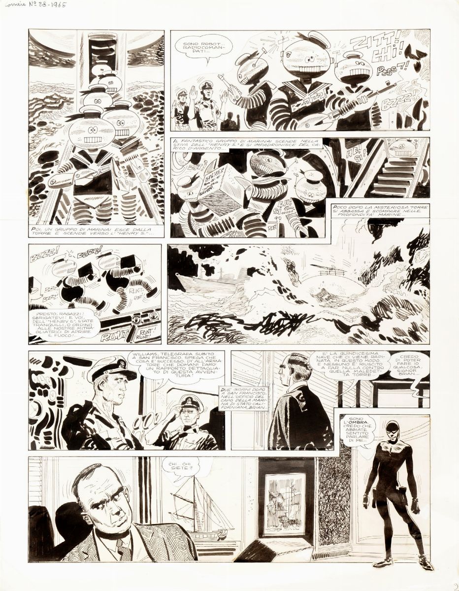 - Original comic art done by Pratt for "L’Ombra", published on page 2 of the second episode entitled "L’Ombra contro l'Ammiraglio" on Corriere dei Piccoli n. 28 in 1965. The very first pages of this famous series by Pratt/Ongaro were re-mounted for the reprint on the volume "L’Ombra" published by Ivaldi in 1982. Crease at the bottom right corner.