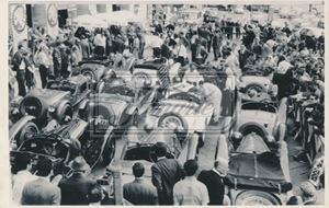 - Photograph of the cars in the closed park in Piazza della Vittoria in Brescia (02/06/1968, Associated Press Photo - 18 cm x 11 cm); - Celebratory poster (50 cm x 70 cm); - Celebratory poster with arrow (65 cm x 40 cm); - Poster with arrow 1000 Miglia, ACI Automobile Club Brescia, Veteran Musical Watch Car Club Brescia (62 cm x 44 cm)