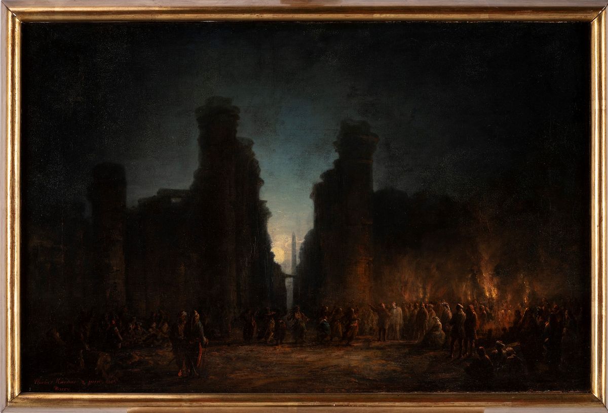 The splendid painting was exhibited by Barry in 1864 at the Paris Salon together with Chouna, extremité de la prémière cataracte du Nil following the journey undertaken by Prince Napoleon and Princess Clotilde in 1863, where the official painter of the trip was François Pierre Barry (Explication des ouvrages de peinture, sculpture, architecture, gravure, et lithographie des artistes vivants exposés au Grand palais des Champs-Élysées, Paris, 1864, p. 17). The importance of this painting is soon said; was the first painter in contact with Prince Napoleon Gerolamo Bonaparte, Ferdinand de Lesseps and Jules Charles Roux to attend the works on the Suez Canal in 1862, and from there he followed the prince throughout the Egyptian journey, providing the Parisian public with the works he they spoke of the East with a greater sense of topicality. The moonlight, the dim lights, the dance and the party are combined in a unique atmosphere with the ruins of the temple of Karnak in a tale that is not only documentary - although this increases its charm - but entirely artistic, in a skill for a painter until 1862 accustomed to recounting maritime episodes of his Marseilles. It was therefore a renewal for Barry in subjects and pictorial research, more fluid and romantic, and the discovery of a more nuanced orientalism in the West.Condition report