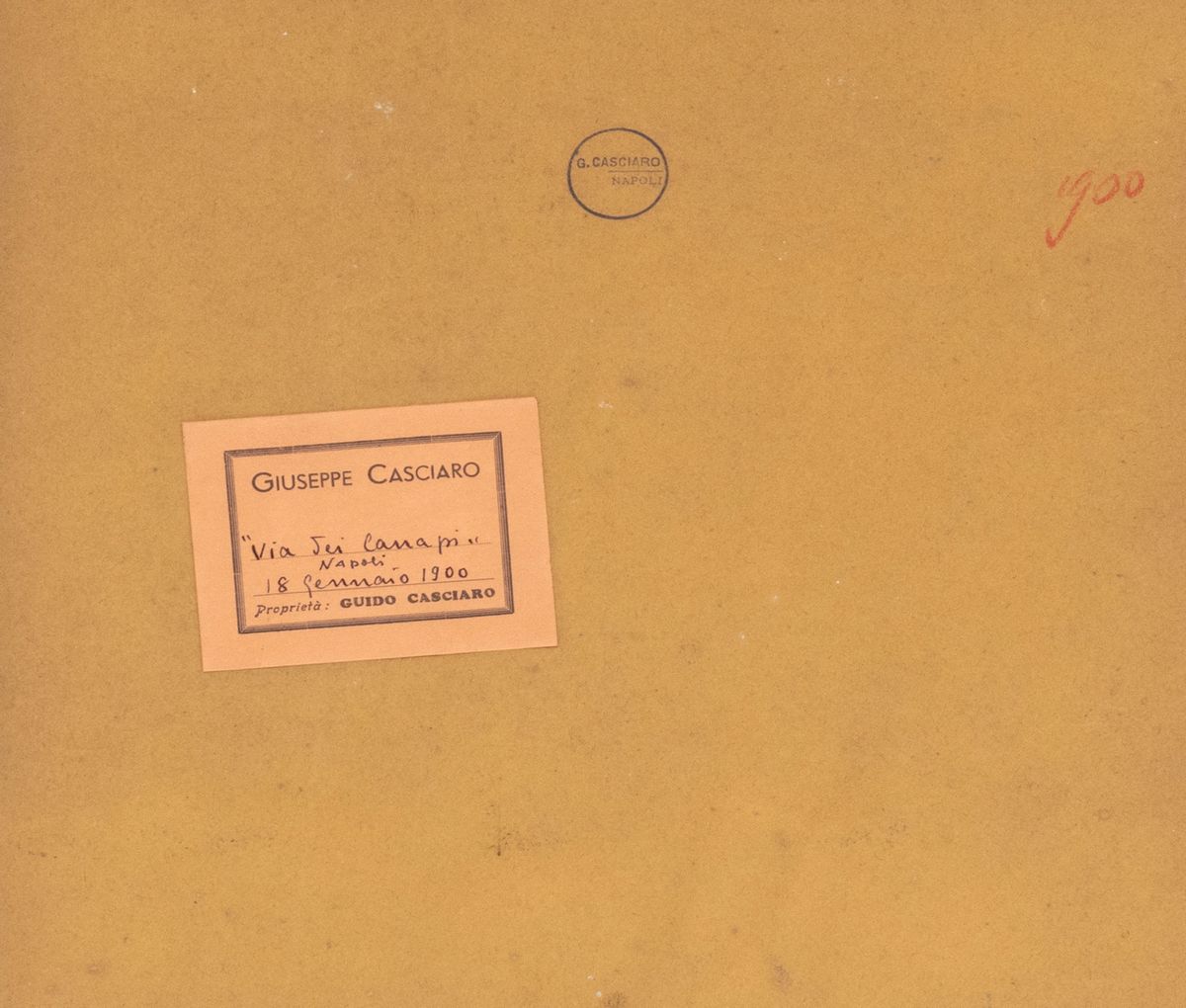 On the back: artist's stamp; date in the artist's hand (1900); printed card of his son Guido Casciaro with title and date (1900).