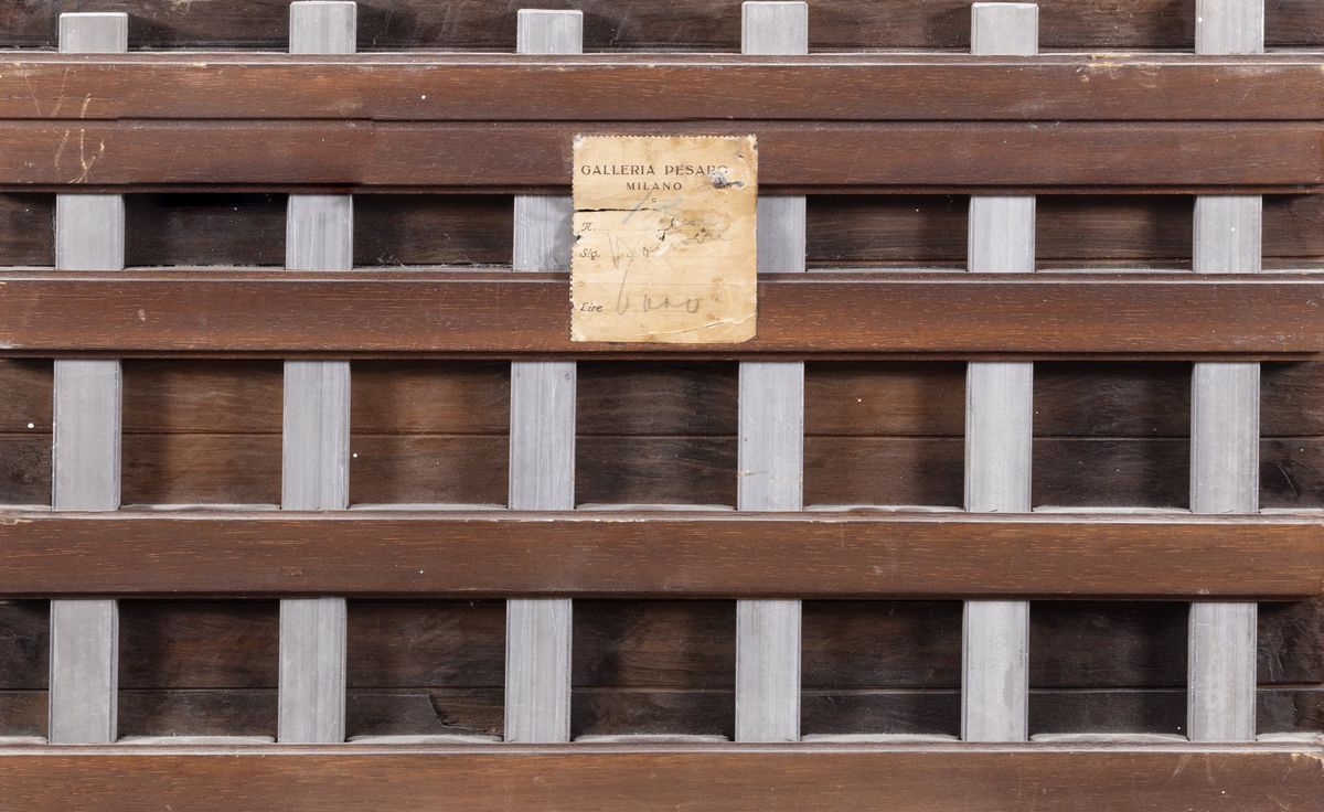 On the back, on the modern parqueting of the table, an ancient label of the Galleria Pesaro in Milan.