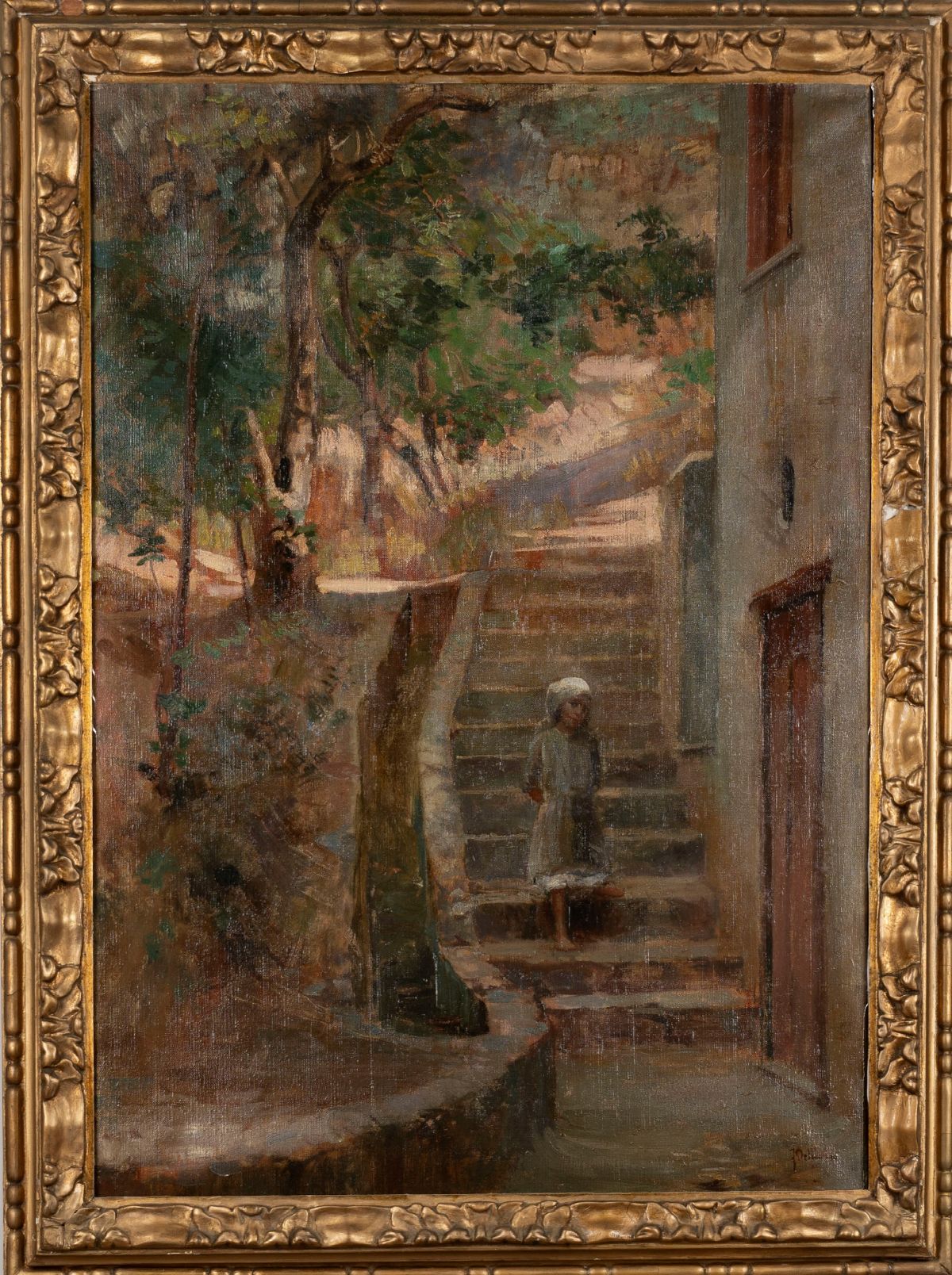 Little girl on the stairs of the ancient village