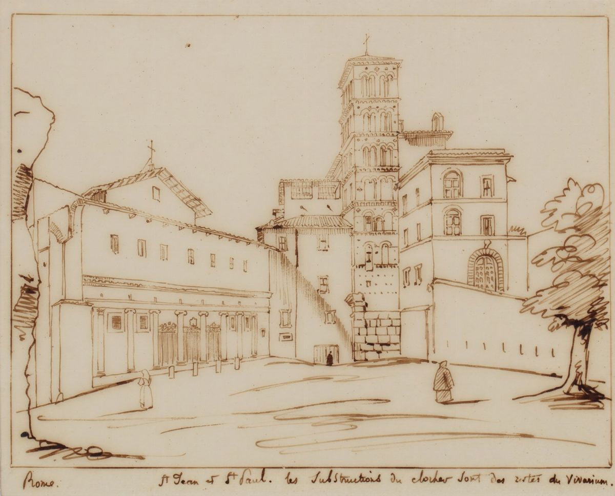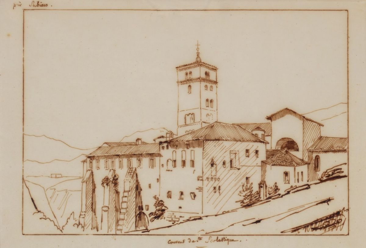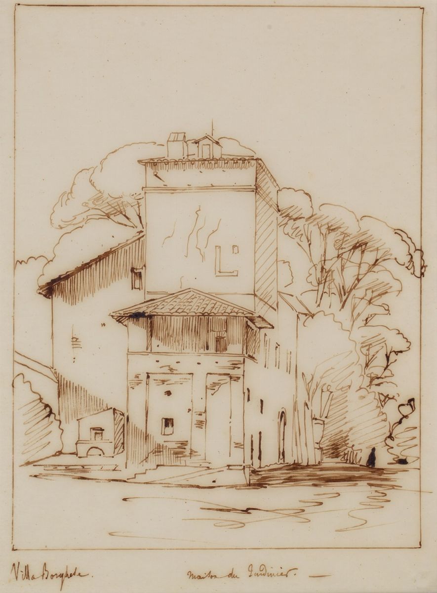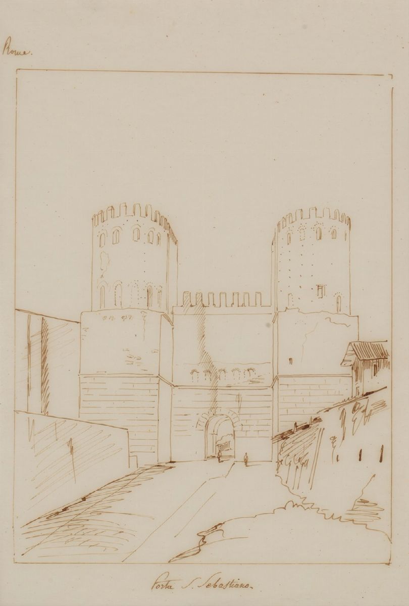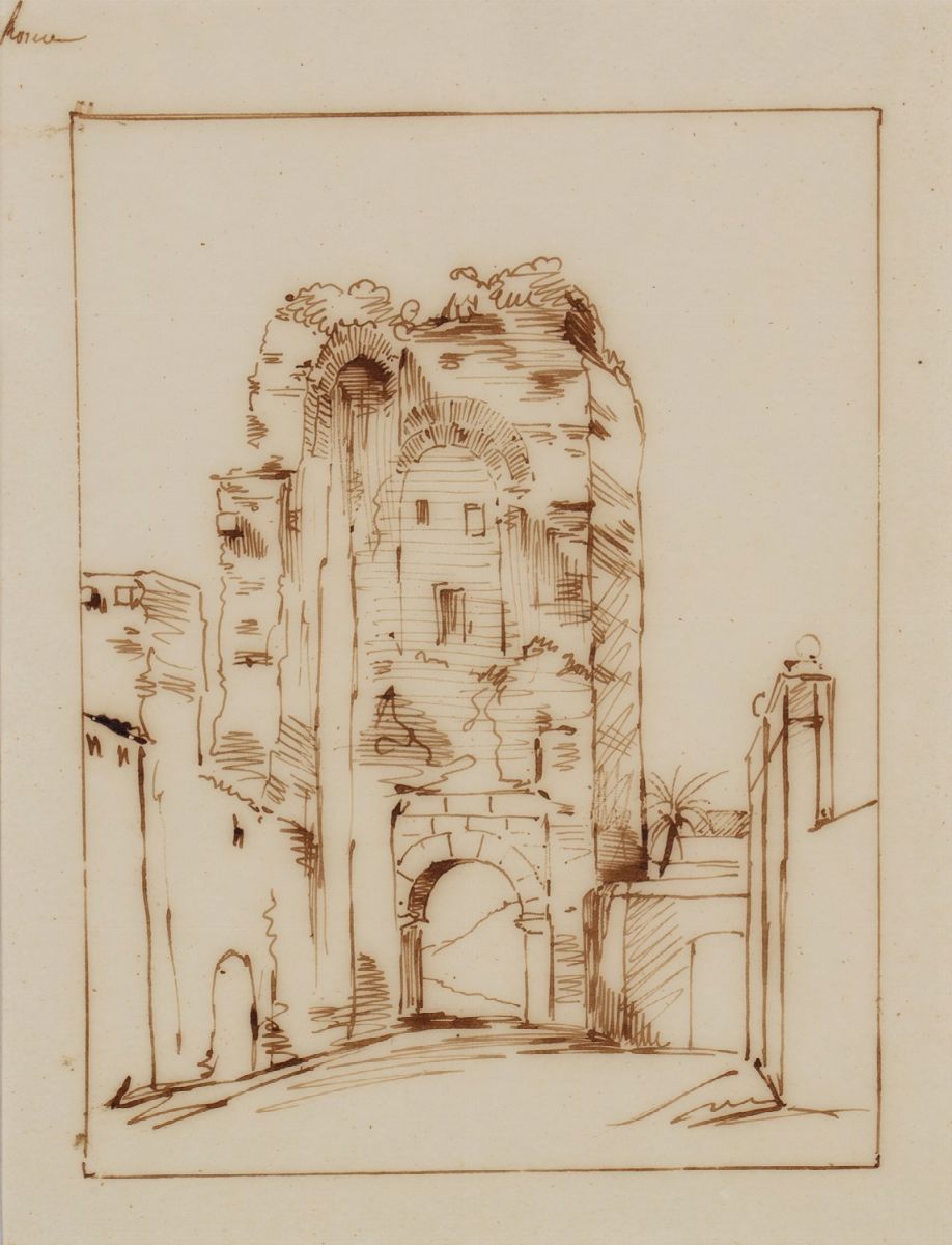 Six views of Rome a) Santa Scolastica monastery in Subiaco cm 21,3 x 31,1 b) Villa Borghese, the gardener's house cm 29 x 21,4 c) San Sebastiano's Gate cm 29,3 x 20 d) The cathedral of Santi Giovanni and Paolo al Celio cm 21,5 x 26,5 e) Ancient door cm 21 x 16 f) Roman sepulchre near the Egeria spring cm 12,4 x 14,3 all ink on tissue paper