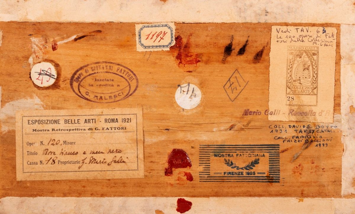 On the back: stamp Opere di GIOVANNI FATTORI / lasciate in eredità a / G MALESCI; printed card Esposizione Belle Arti - Roma 1921 / Mostra Retrospettiva di G. FATTORI with title, reference number (120) and owner; stamp Mostra Fattoriana / Firenze 1925; stamp and card printed Mario Galli collezione d'arte with reference number (28); other ancient writings and reference labels.