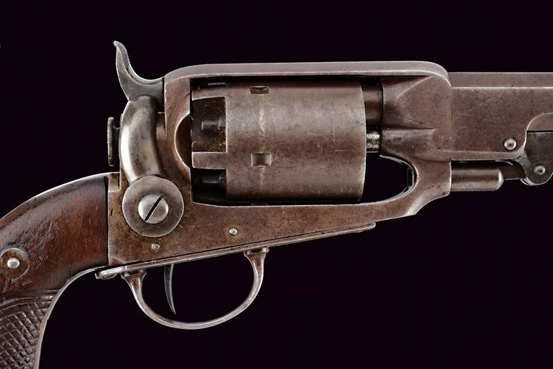 Octagonal, rifled, 8", 44 cal barrel, (some signs of use inside, visible rifling), marked "B. F. JOSLYN / PATD. MAY 4th, 1858" at the base, front sight. Smooth, five-shot cylinder. Working mechanism. Smooth frame with mark "2" at the bottom. Side hammer. Iron trigger guard (the rear holding screw is slightly loosened). Wooden grips with knurled segment at the centre, one with notches (apparently not random) at the lower edge. Serial number "4xx" inside the handle. The surfaces are well preserved with some very small pitting.