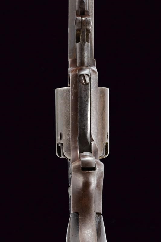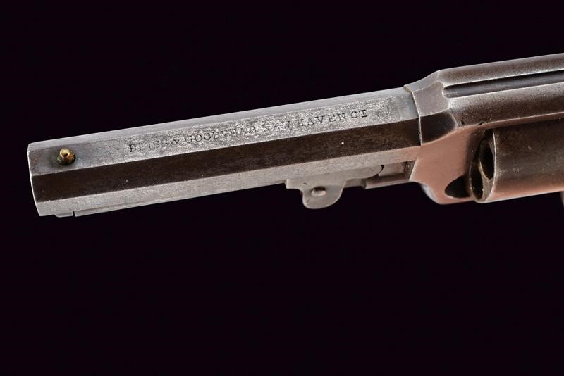 Octagonal, 28 cal barrel (signs of use inside, visible rifling) with conical front sight, remainsof the marking "BLISS & GOODYEAR NEW HAVEN CT.". Six-shot cylinder. Working mechanism. Frame with spur trigger. Serial number "2xx" on the underside of the barrel, remains of the same numbering under the grip. Remains of antique bluing. Handle with wooden grips.