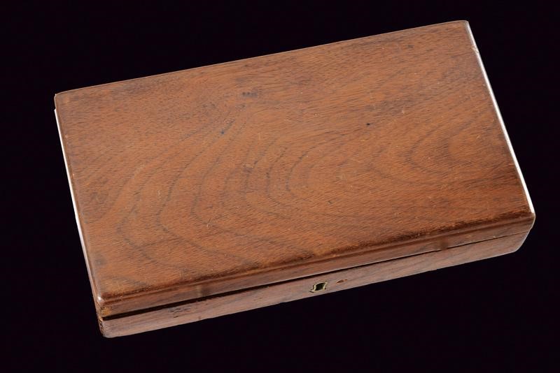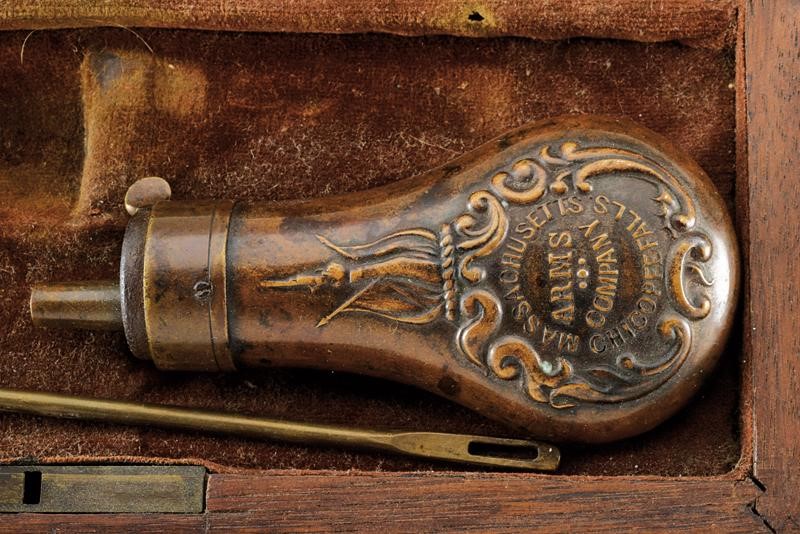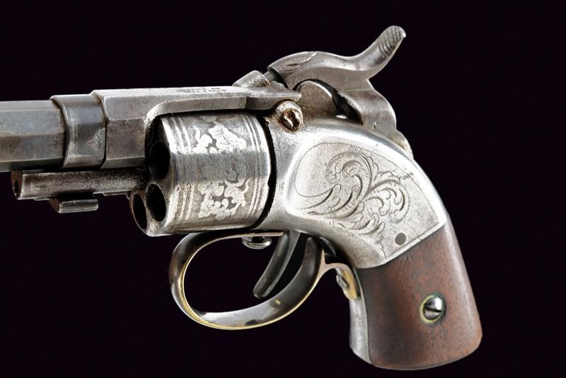 Round, rifled, 28 cal. barrel with foresight; engraved, six-shot cylinder, the grip-strap marked "MASS. ARMS CO/CHICOPEE FALLS", the frame engraved with floral motifs and marked "MAYNARD'S PATENT SEP. 22 1845"; the right side can be opened to put the cartridge; wooden grip scales. Kept in its wooden case with burgundy velvet covering, complete with tools. Rare.