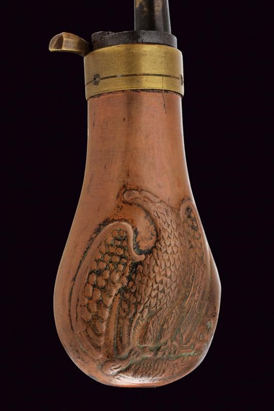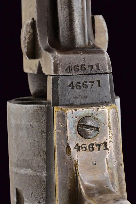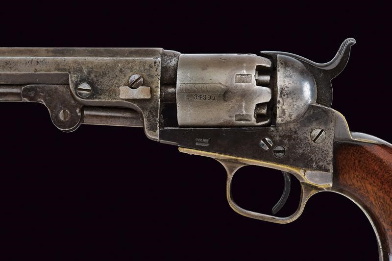 Octagonal, 6", 31 cal. barrel with cylindrical brass foresight, mark between braces "ADDRESS SAM.L COLT / NEW-YORK CITY". Visible rifling, bore with pitting. Smooth, five-shot cylinder, marked "COLTS PATENT / N°34xxx" and with engraving traces of the highway robbery. Working mechanism. Frame also marked "COLTS PATENT". Silver-plated brass gripstraps. Walnut grip. Matching serial number "466xx" on the cartridge rammer (abbreviated), on the barrel, on the trigger guard and on the gripstraps, different on the cylinder. Kept in a wooden case lined on the inside with burgundy velvet with a flask, a bullet mold and a small drum box, key for the lock. Minor general defects.