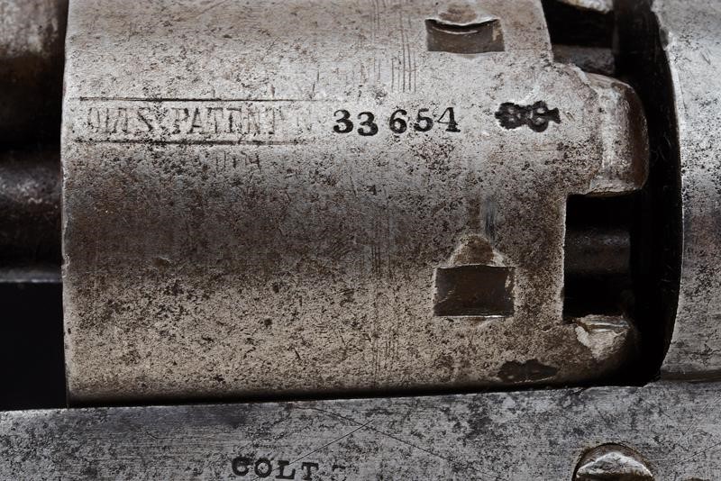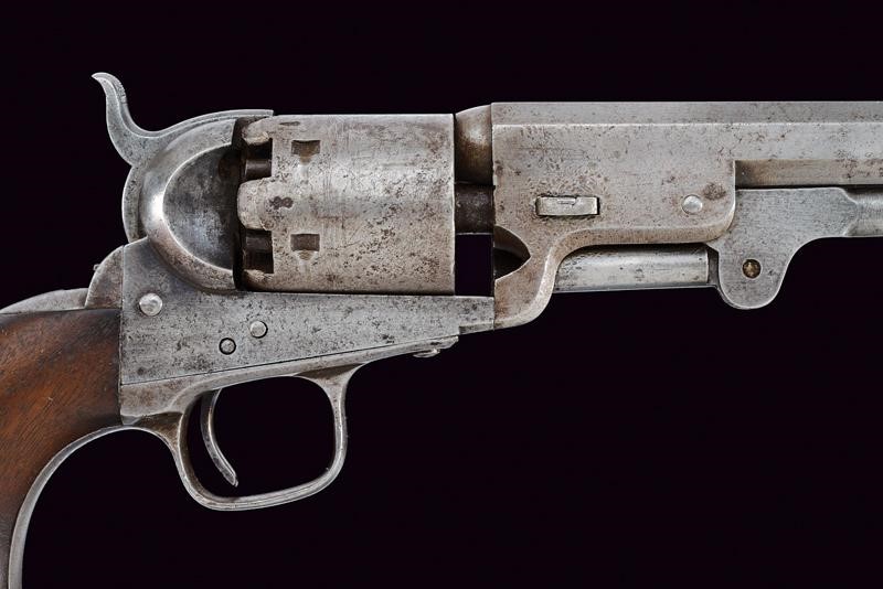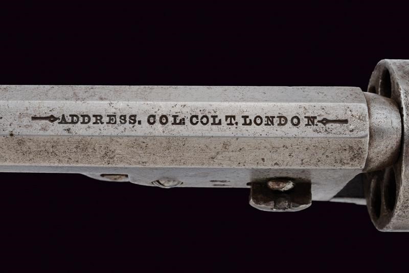 Octagonal, rifled, 7-1/2", 36 cal barrel (signs of use and some pitting inside, visible rifling), with small brass front sight, dorsal mark "ADDRESS: COL. COLT LONDON", with marks of the London test bench on the left side. Lever of cartridge rammer and barrel with numbering matching the frame. Six-shot cylinder with remains of naval battle scene between the Texan and Mexican fleets, marks of the London test bench near the nipples, marching serial number clearly legible. Frame marked with "COLTS PATENT" on the left side; serial no. "33xxx". Wide rounded trigger guard, iron handle bands, with matching serial numbers. Medium-good condition. Walnut handle with a small missing part.