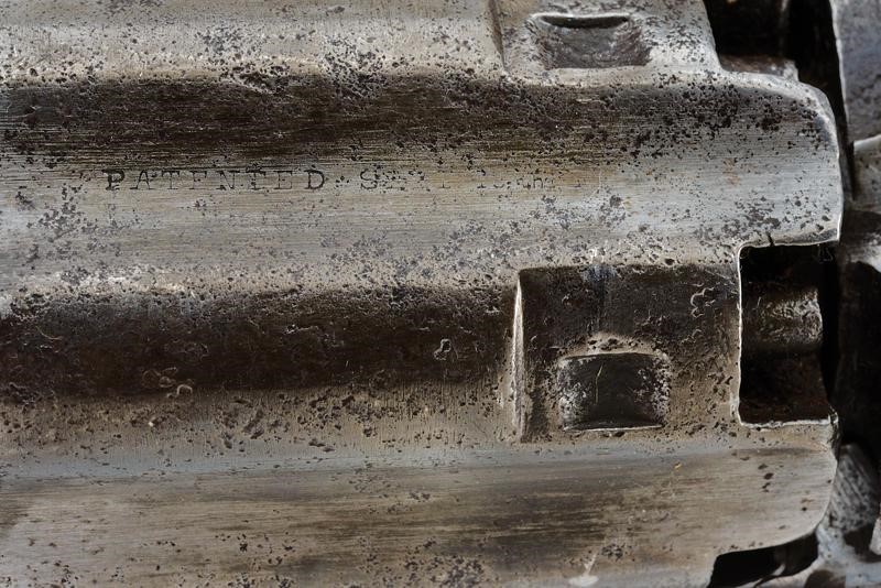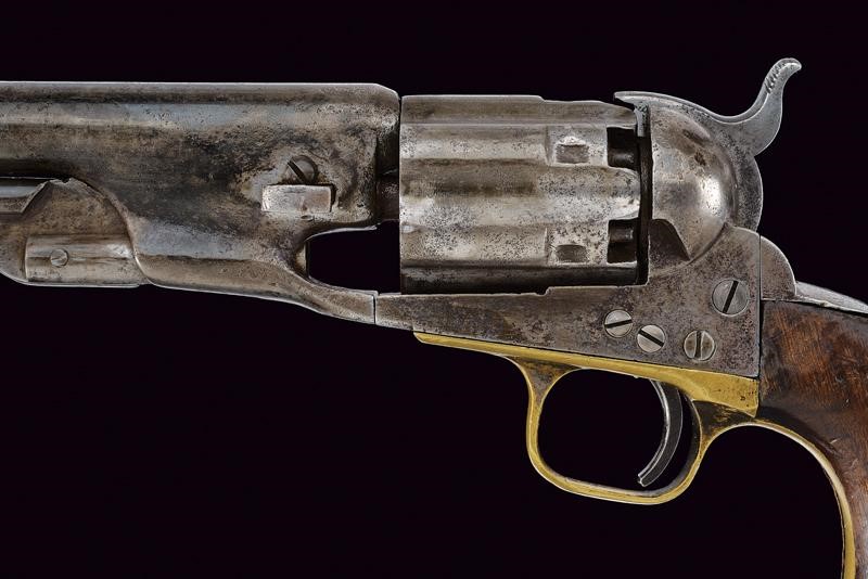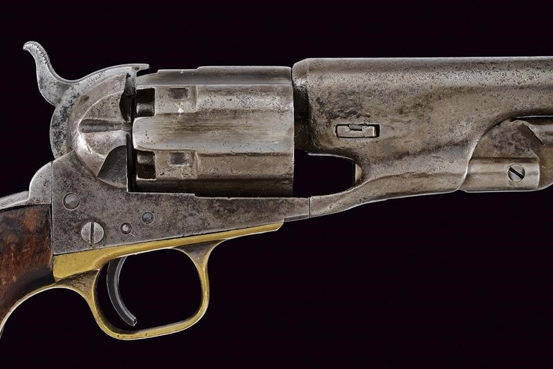7-1/2", round, 44 cal. barrel (heavy pitting inside), with traces of "...RICA-" mark on the back (the rest no longer legible). Rebated and fluted cylinder, with traces of patent mark. Working mechanism. Frame with four screws and cut-outs in the recoil shield for mounting of a removable butt (missing), serial number "38xx", remains of the same serial number at the base of the barrel. Brass trigger guard with matching and clearly visible serial number. Iron back band with remains of matching serial number and a slot for the removable butt at the base of the grip. Iron surfaces with signs of use, time and various pitting.