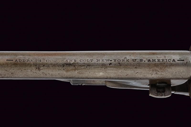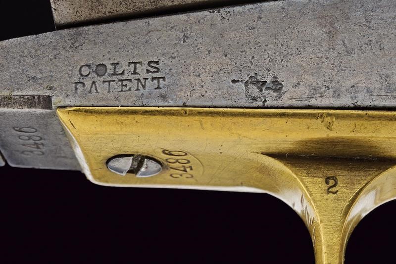 Cylindrical, rifled, 7-1/2", 36 cal. barrel (visible rifling, some pitting inside), standard mark on the back. The barrel wedge with numbers not matching with the rest of the components. Six-shot cylinder, with faint traces of battle between the Texan and Mexican fleets, patent and serial numbers more visible (matching with the rest of the components). Working mechanism. Frame with "COLTS PATENT" mark on the left side, serial number "34xx" also present on the pin of the cylinder (the same numbering is present on the barrel, cylinder, and gripstraps). Trigger guard marked "36 CAL". Brass bands. Some pitting. Walnut grip.
