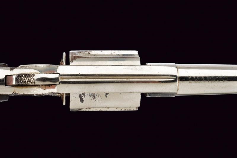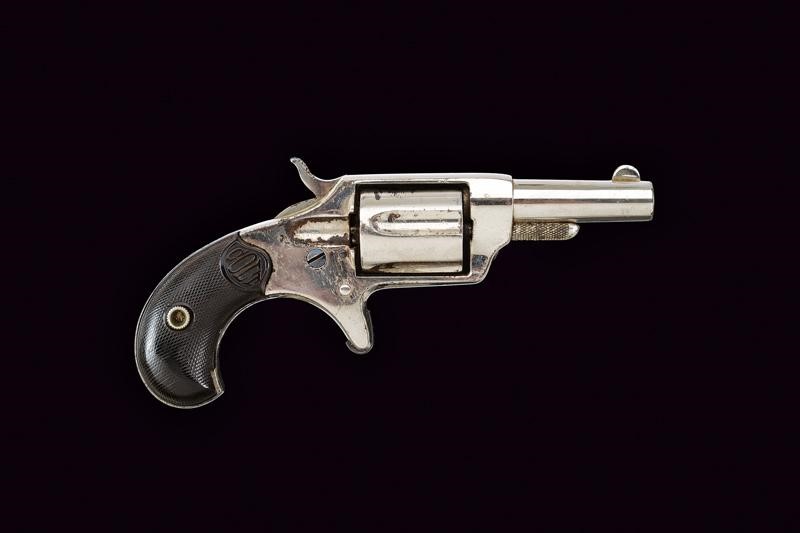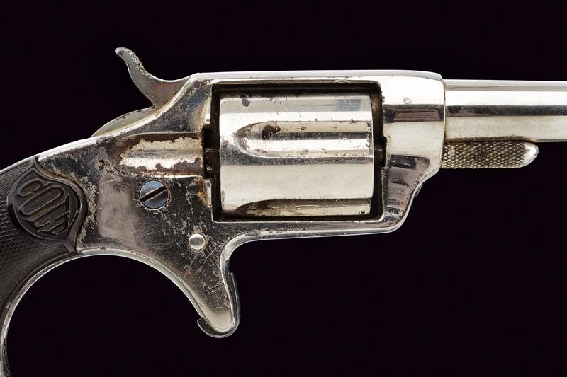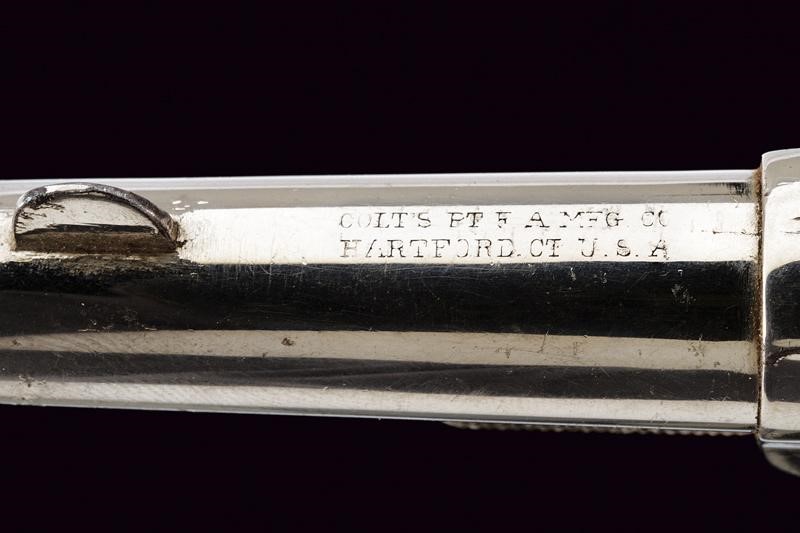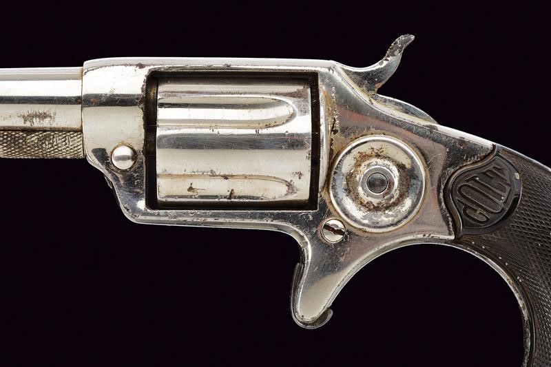 Round, rifled, 32 centerfire cal barrel (bore with signs of use, visible rifling), with remains of the company markings. Five-shot cylinder. Frame with spur trigger. Knurled, hard-rubber grips with the mark "COLT". Working mechanism. Signs of use and time. Nickel plating with pitting.