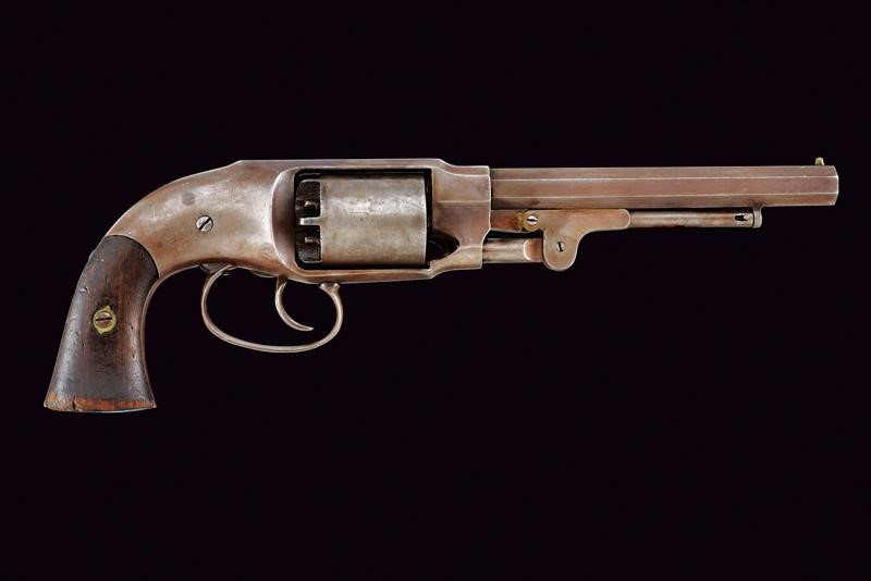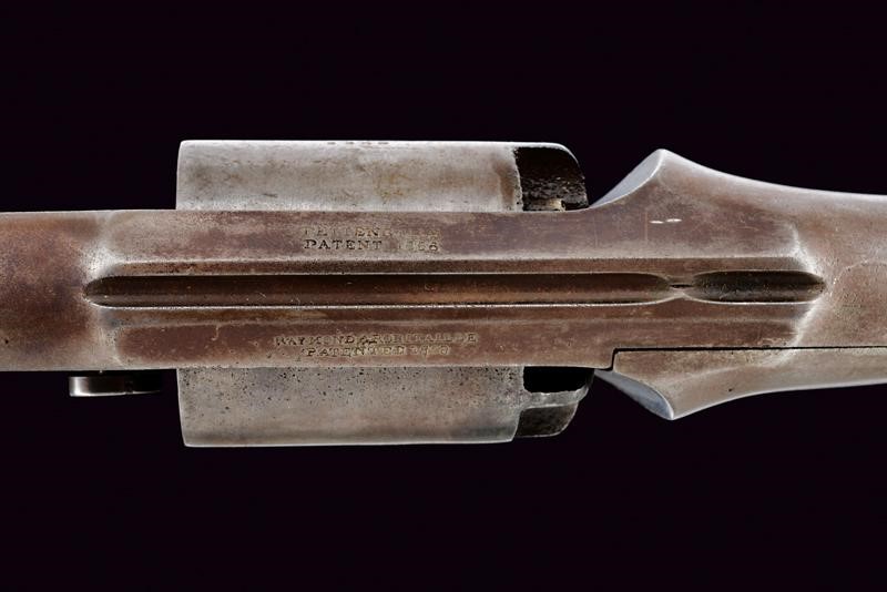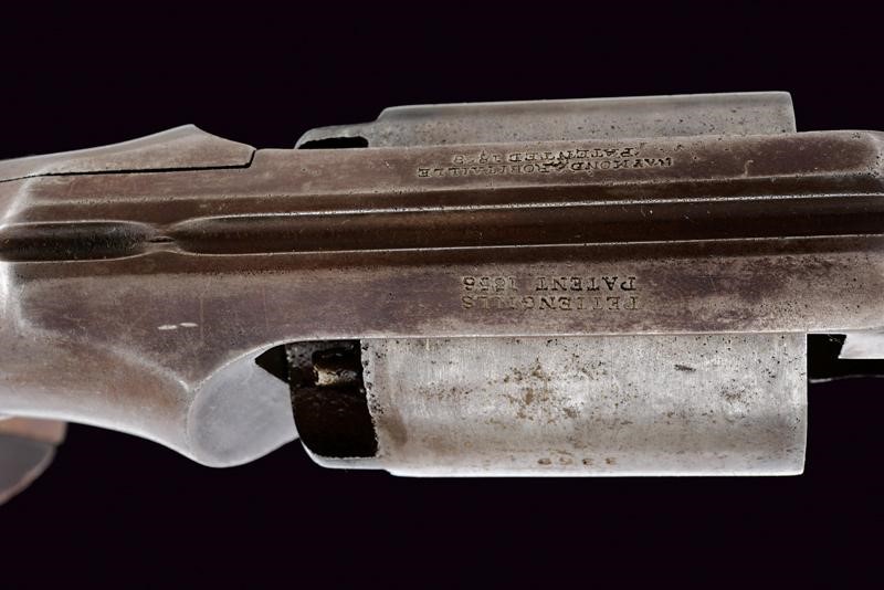 Octagonal, rifled, 7-1/2", 44 cal barrel (clean bore, visible rifling) with brass front sight, marked "WW" at the base. Six-shot cylinder with double-action operation (problems with the cylinder rotation). Frame with remains of a shield stamp in the lower part. Back with markings "PETTENGILLS PATENT 1856" and "RAYMOND & ROBINTAILLE PATENTED 1858". Serial number '33xx' marching on the cylinder and handle. Walnut grips, the left one with remains of an inspection stamp (not clearly legible), both grips with serial number matching the revolver and mark "H".
