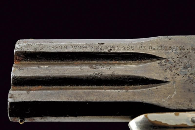 Two, octagonal, over-and-under barrels marked "WESSON WORCESTER MASS PT. DEC. 15/68", bronze frame with remains of nickelling and serial number "14xx", spur trigger. Wooden grip scales. Production: less than 3000 examples. Rare.