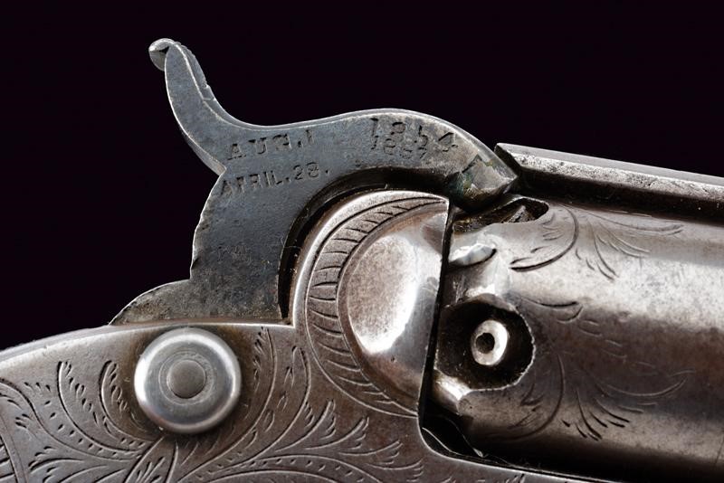 Octagonal, 3-3/4", 28 cal barrel with brass conical front sight (bore needs cleaning, visible rifling). Six-shot cylinder with floral engravings at the base. Iron frame with floral engravings. "Sidehammer" type hammer with remains of antique browning and with markings "ELLS PATENT / AUG 1 1854 APRIL 28 1857". Mechanism working in double action only. With number "22" inside the grip and on one of the grips. Wooden grips. Small spots with remains of antique bluing.