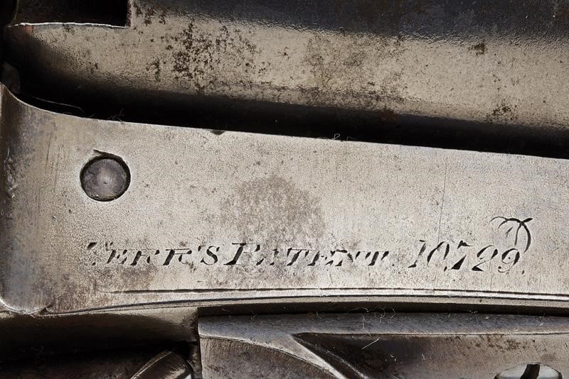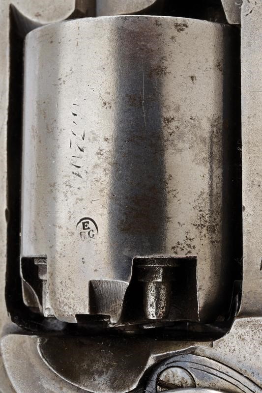 Faceted, rifled, 44 cal barrel (clean bore, visible rifling), with brass cusped front sight. Five-shot cylinder with crowned "AF" mark, stmap of the Liège test bench, remains of coeval serial number at the frame. Mechanism working in single action. frame with remains of Kerr patent marking and serial number "107xx". Lock without markings. Knurled wooden handle. Ring for the strap. Some spot with small remains of finishing.