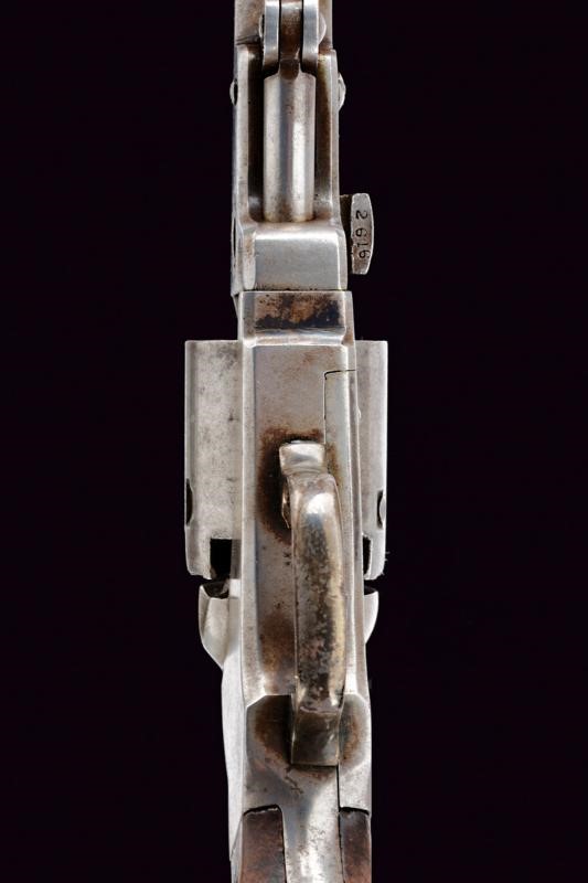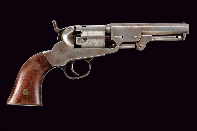 Octagonal, rifled, 31 cal barrel (bore with some pitting, visible rifling), provided with sight shaped as a truncated cone, with remnants of marking "NEPPERHAN FIRE ARMS CO. The cartridge rammer wedge with small defects. Five-shot cylinder. The rotation is not perfect yet still working. Serial number "26xx" matching on the barrel wedge, the cartridge rammer lever and the trigger. Some parts with small remains of antique bluing. Pitting at the base of the cylinder. The trigger guard with remains of probably silver-plated finish. Walnut grips.